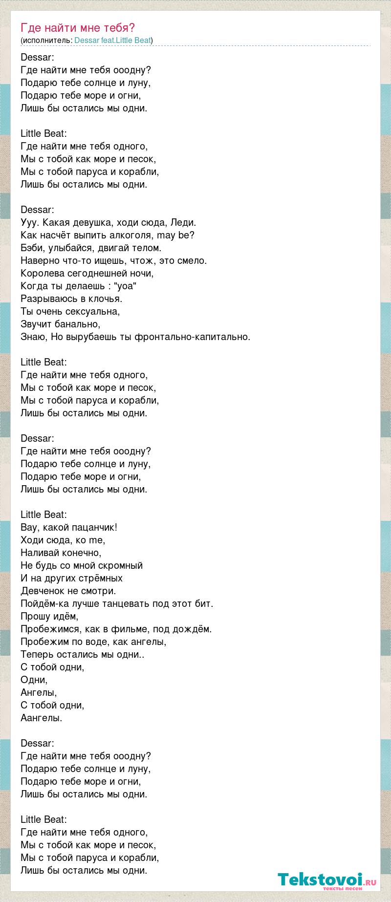 Dessar: Где найти мне тебя ооодну? Подарю тебе солнце и луну, Подарю тебе море и огни, Лишь бы остались мы одни. Little Beat: Где найти мне тебя одного, Мы с тобой как море и песок, Мы с тобой паруса и корабли, Лишь бы остались мы одни. Dessar: Ууу. Какая девушка, ходи сюда, Леди. Как насчёт выпить алкоголя, may be? Бэби, улыбайся, двигай телом. Наверно что-то ищешь, чтож, это смело. Королева сегоднешней ночи, Когда ты делаешь : "уоа" Разрываюсь в клочья. Ты очень сексуальна, Звучит банально, Знаю, Но вырубаешь ты фронтально-капитально. Little Beat: Где найти мне тебя одного, Мы с тобой как море и песок, Мы с тобой паруса и корабли, Лишь бы остались мы одни. Dessar: Где найти мне тебя ооодну? Подарю тебе солнце и луну, Подарю тебе море и огни, Лишь бы остались мы одни. Little Beat: Вау, какой пацанчик! Ходи сюда, ко me, Наливай конечно, Не будь со мной скромный И на других стрёмных Девченок не смотри. Пойдём-ка лучше танцевать под этот бит. Прошу идём, Пробежимся, как в фильме, под дождём. Пробежим по воде, как ангелы, Теперь остались мы одни.. С тобой одни, Одни, Ангелы, С тобой одни, Аангелы. Dessar: Где найти мне тебя ооодну? Подарю тебе солнце и луну, Подарю тебе море и огни, Лишь бы остались мы одни. Little Beat: Где найти мне тебя одного, Мы с тобой как море и песок, Мы с тобой паруса и корабли, Лишь бы остались мы одни.