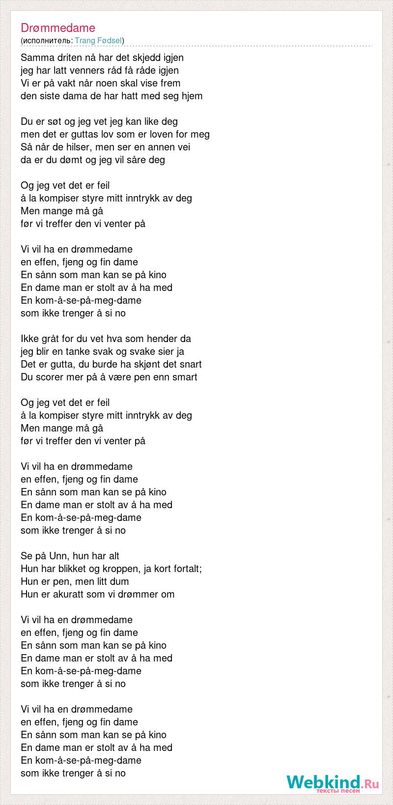 Samma driten nå har det skjedd igjen jeg har latt venners råd få råde igjen Vi er på vakt når noen skal vise frem den siste dama de har hatt med seg hjem Du er søt og jeg vet jeg kan like deg men det er guttas lov som er loven for meg Så når de hilser, men ser en annen vei da er du dømt og jeg vil såre deg Og jeg vet det er feil å la kompiser styre mitt inntrykk av deg Men mange må gå før vi treffer den vi venter på Vi vil ha en drømmedame en effen, fjeng og fin dame En sånn som man kan se på kino En dame man er stolt av å ha med En kom-å-se-på-meg-dame som ikke trenger å si no Ikke gråt for du vet hva som hender da jeg blir en tanke svak og svake sier ja Det er gutta, du burde ha skjønt det snart Du scorer mer på å være pen enn smart Og jeg vet det er feil å la kompiser styre mitt inntrykk av deg Men mange må gå før vi treffer den vi venter på Vi vil ha en drømmedame en effen, fjeng og fin dame En sånn som man kan se på kino En dame man er stolt av å ha med En kom-å-se-på-meg-dame som ikke trenger å si no Se på Unn, hun har alt Hun har blikket og kroppen, ja kort fortalt; Hun er pen, men litt dum Hun er akuratt som vi drømmer om Vi vil ha en drømmedame en effen, fjeng og fin dame En sånn som man kan se på kino En dame man er stolt av å ha med En kom-å-se-på-meg-dame som ikke trenger å si no Vi vil ha en drømmedame en effen, fjeng og fin dame En sånn som man kan se på kino En dame man er stolt av å ha med En kom-å-se-på-meg-dame som ikke trenger å si no