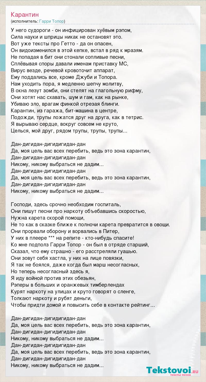 У него судороги - он инфицирован хуёвым рэпом, Сила науки и шприцы никак не остановят это. Вот уже тексты про Гетто - да он опасен, Он видоизменился в этой кепке, встал в ряд к мразям. Не попадая в бит они стонали сопливые песни, Сплёвывая споры давали именам приставку МС, Вирус везде, речевой кровоточит аппарат, Ему поддались все, кроме Джуби и Топора. Нам уходить пора, я медленно шепчу молитву, В окна лезут зомби, они стелят на глагольную рифму, Они хотят нас схавать, шум и гам, как на рынке, Убиваю зло, врагам финкой отрезая блинги. Карантин, из гаража, бит-машина в центре, Подожди, трупы ложатся друг на друга, как в тетрис. Я вырываю сердце, вокруг совсем не круто, Целься, мой друг, рядом трупы, трупы, трупы... Дан-дигидан-дигидигидан-дан Да, моя цель вас всех перебить, ведь это зона карантин, Дан-дигидан-дигидигидан-дан Никому, никому выбраться не дадим... Дан-дигидан-дигидигидан-дан Да, моя цель вас всех перебить, ведь это зона карантин, Дан-дигидан-дигидигидан-дан Никому, никому выбраться не дадим... Господи, здесь срочно необходим госпиталь, Они пишут песни про наркоту объебавшись скоростью, Нужна карета скорой помощи, Не то как в сказке ближе к полночи карета превратится в овощи. Они прорвали оборону и ворвались в Питер, У них в плеере *** на репите - кто-нибудь спасите! Ко мне подполз Гарри Топор - он был в отряде старший, Сказал, что ему страшно - его расстреляли гуашью. Они зовут себя хастла, у них на лице повязки, Я так не боялся, даже когда был марш несогласных, Но теперь несогласный здесь я, Я иду войной против этих обезьян, Рэперы в больших и оранжевых тимберлендах Курят наркоту на улицах и круто говорят о сленге, Толкают наркоту и рубят деньги, Чтобы придти домой и повысить себе в контакте рейтинг... Дан-дигидан-дигидигидан-дан Да, моя цель вас всех перебить, ведь это зона карантин, Дан-дигидан-дигидигидан-дан Никому, никому выбраться не дадим... Дан-дигидан-дигидигидан-дан Да, моя цель вас всех перебить, ведь это зона карантин, Дан-дигидан-дигидигидан-дан Никому, никому выбраться не дадим...