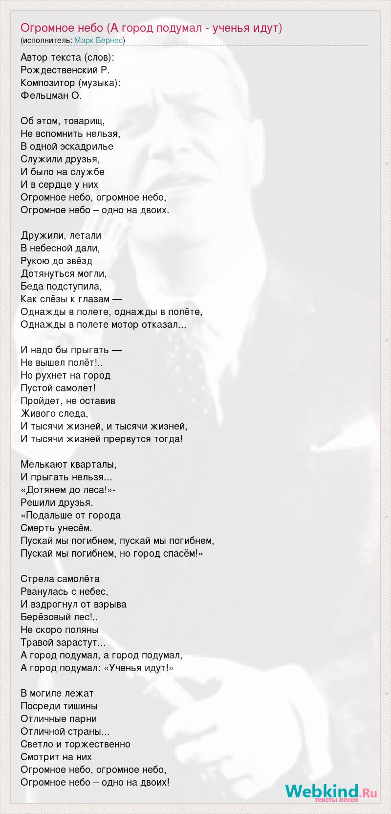 Автор текста (слов): Рождественский Р. Композитор (музыка): Фельцман О. Об этом, товарищ, Не вспомнить нельзя, В одной эскадрилье Служили друзья, И было на службе И в сердце у них Огромное небо, огромное небо, Огромное небо – одно на двоих. Дружили, летали В небесной дали, Рукою до звёзд Дотянуться могли, Беда подступила, Как слёзы к глазам — Однажды в полете, однажды в полёте, Однажды в полете мотор отказал... И надо бы прыгать — Не вышел полёт!.. Но рухнет на город Пустой самолет! Пройдет, не оставив Живого следа, И тысячи жизней, и тысячи жизней, И тысячи жизней прервутся тогда! Мелькают кварталы, И прыгать нельзя... «Дотянем до леса!»- Решили друзья. «Подальше от города Смерть унесём. Пускай мы погибнем, пускай мы погибнем, Пускай мы погибнем, но город спасём!» Стрела самолёта Рванулась с небес, И вздрогнул от взрыва Берёзовый лес!.. Не скоро поляны Травой зарастут... А город подумал, а город подумал, А город подумал: «Ученья идут!» В могиле лежат Посреди тишины Отличные парни Отличной страны... Светло и торжественно Смотрит на них Огромное небо, огромное небо, Огромное небо – одно на двоих!