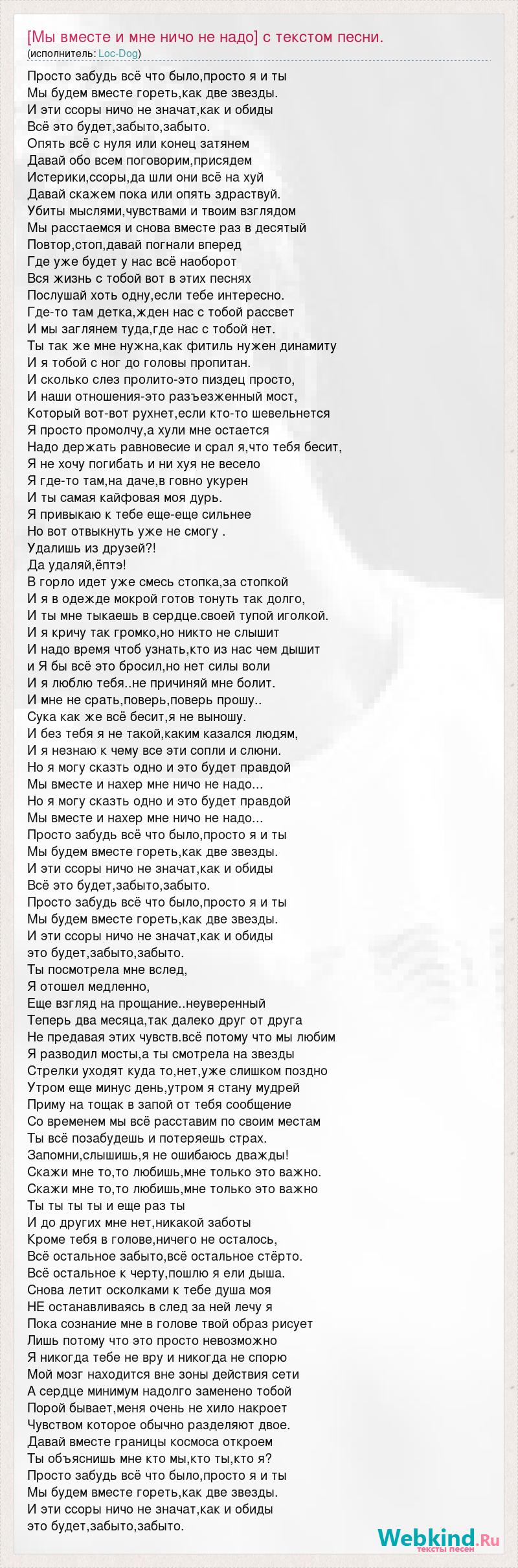 Просто забудь всё что было,просто я и ты Мы будем вместе гореть,как две звезды. И эти ссоры ничо не значат,как и обиды Всё это будет,забыто,забыто. Опять всё с нуля или конец затянем Давай обо всем поговорим,присядем Истерики,ссоры,да шли они всё на хуй Давай скажем пока или опять здраствуй. Убиты мыслями,чувствами и твоим взглядом Мы расстаемся и снова вместе раз в десятый Повтор,стоп,давай погнали вперед Где уже будет у нас всё наоборот Вся жизнь с тобой вот в этих песнях Послушай хоть одну,если тебе интересно. Где-то там детка,жден нас с тобой рассвет И мы заглянем туда,где нас с тобой нет. Ты так же мне нужна,как фитиль нужен динамиту И я тобой с ног до головы пропитан. И сколько слез пролито-это пиздец просто, И наши отношения-это разъезженный мост, Который вот-вот рухнет,если кто-то шевельнется Я просто промолчу,а хули мне остается Надо держать равновесие и срал я,что тебя бесит, Я не хочу погибать и ни хуя не весело Я где-то там,на даче,в говно укурен И ты самая кайфовая моя дурь. Я привыкаю к тебе еще-еще сильнее Но вот отвыкнуть уже не смогу . Удалишь из друзей?! Да удаляй,ёптэ! В горло идет уже смесь стопка,за стопкой И я в одежде мокрой готов тонуть так долго, И ты мне тыкаешь в сердце.своей тупой иголкой. И я кричу так громко,но никто не слышит И надо время чтоб узнать,кто из нас чем дышит и Я бы всё это бросил,но нет силы воли И я люблю тебя..не причиняй мне болит. И мне не срать,поверь,поверь прошу.. Сука как же всё бесит,я не выношу. И без тебя я не такой,каким казался людям, И я незнаю к чему все эти сопли и слюни. Но я могу сказть одно и это будет правдой Мы вместе и нахер мне ничо не надо... Но я могу сказть одно и это будет правдой Мы вместе и нахер мне ничо не надо... Просто забудь всё что было,просто я и ты Мы будем вместе гореть,как две звезды. И эти ссоры ничо не значат,как и обиды Всё это будет,забыто,забыто. Просто забудь всё что было,просто я и ты Мы будем вместе гореть,как две звезды. И эти ссоры ничо не значат,как и обиды это будет,забыто,забыто. Ты посмотрела мне вслед, Я отошел медленно, Еще взгляд на прощание..неуверенный Теперь два месяца,так далеко друг от друга Не предавая этих чувств.всё потому что мы любим Я разводил мосты,а ты смотрела на звезды Стрелки уходят куда то,нет,уже слишком поздно Утром еще минус день,утром я стану мудрей Приму на тощак в запой от тебя сообщение Со временем мы всё расставим по своим местам Ты всё позабудешь и потеряешь страх. Запомни,слышишь,я не ошибаюсь дважды! Скажи мне то,то любишь,мне только это важно. Скажи мне то,то любишь,мне только это важно Ты ты ты ты и еще раз ты И до других мне нет,никакой заботы Кроме тебя в голове,ничего не осталось, Всё остальное забыто,всё остальное стёрто. Всё остальное к черту,пошлю я ели дыша. Снова летит осколками к тебе душа моя НЕ останавливаясь в след за ней лечу я Пока сознание мне в голове твой образ рисует Лишь потому что это просто невозможно Я никогда тебе не вру и никогда не спорю Мой мозг находится вне зоны действия сети А сердце минимум надолго заменено тобой Порой бывает,меня очень не хило накроет Чувством которое обычно разделяют двое. Давай вместе границы космоса откроем Ты объяснишь мне кто мы,кто ты,кто я? Просто забудь всё что было,просто я и ты Мы будем вместе гореть,как две звезды. И эти ссоры ничо не значат,как и обиды это будет,забыто,забыто.