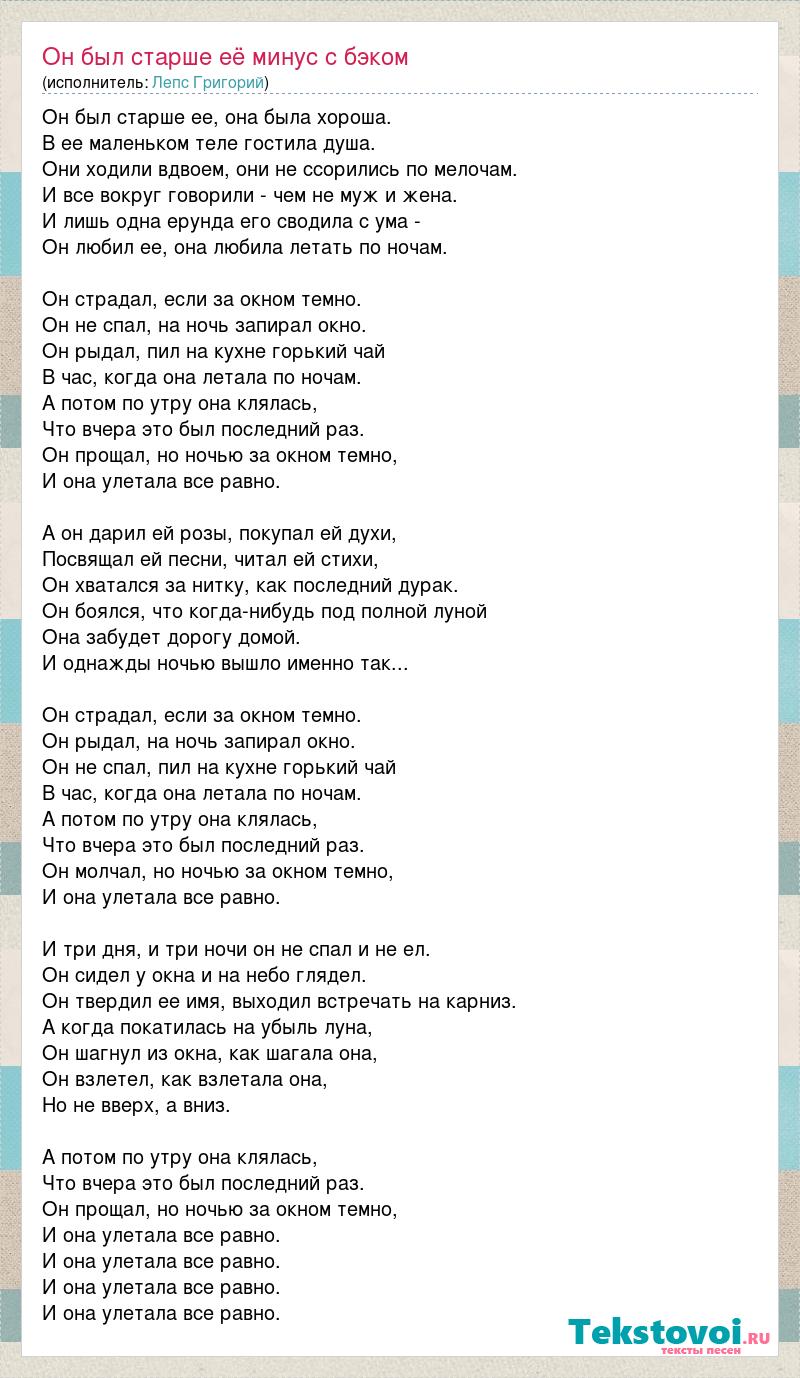 Он был старше ее, она была хороша. В ее маленьком теле гостила душа. Они ходили вдвоем, они не ссорились по мелочам. И все вокруг говорили - чем не муж и жена. И лишь одна ерунда его сводила с ума - Он любил ее, она любила летать по ночам. Он страдал, если за окном темно. Он не спал, на ночь запирал окно. Он рыдал, пил на кухне горький чай В час, когда она летала по ночам. А потом по утру она клялась, Что вчера это был последний раз. Он прощал, но ночью за окном темно, И она улетала все равно. А он дарил ей розы, покупал ей духи, Посвящал ей песни, читал ей стихи, Он хватался за нитку, как последний дурак. Он боялся, что когда-нибудь под полной луной Она забудет дорогу домой. И однажды ночью вышло именно так... Он страдал, если за окном темно. Он рыдал, на ночь запирал окно. Он не спал, пил на кухне горький чай В час, когда она летала по ночам. А потом по утру она клялась, Что вчера это был последний раз. Он молчал, но ночью за окном темно, И она улетала все равно. И три дня, и три ночи он не спал и не ел. Он сидел у окна и на небо глядел. Он твердил ее имя, выходил встречать на карниз. А когда покатилась на убыль луна, Он шагнул из окна, как шагала она, Он взлетел, как взлетала она, Но не вверх, а вниз. А потом по утру она клялась, Что вчера это был последний раз. Он прощал, но ночью за окном темно, И она улетала все равно. И она улетала все равно. И она улетала все равно. И она улетала все равно.