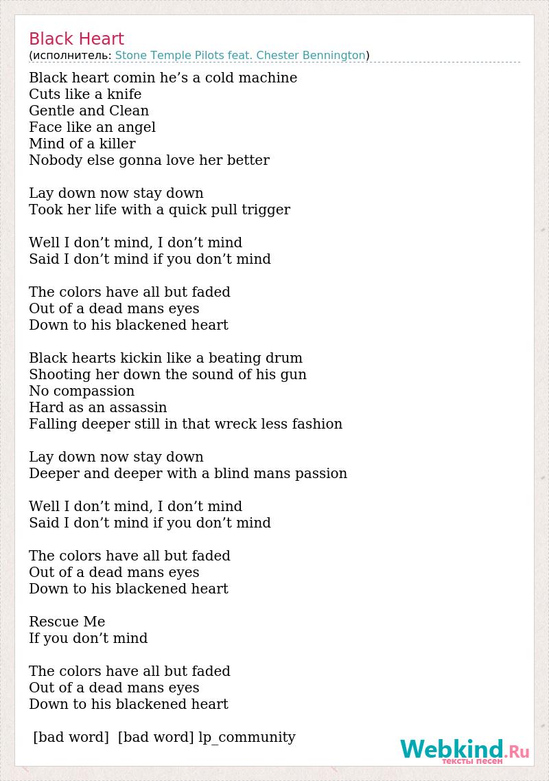 Black heart comin he’s a cold machine Cuts like a knife Gentle and Clean Face like an angel Mind of a killer Nobody else gonna love her better Lay down now stay down Took her life with a quick pull trigger Well I don’t mind, I don’t mind Said I don’t mind if you don’t mind The colors have all but faded Out of a dead mans eyes Down to his blackened heart Black hearts kickin like a beating drum Shooting her down the sound of his gun No compassion Hard as an assassin Falling deeper still in that wreck less fashion Lay down now stay down Deeper and deeper with a blind mans passion Well I don’t mind, I don’t mind Said I don’t mind if you don’t mind The colors have all but faded Out of a dead mans eyes Down to his blackened heart Rescue Me If you don’t mind The colors have all but faded Out of a dead mans eyes Down to his blackened heart [bad word] [bad word] lp_community