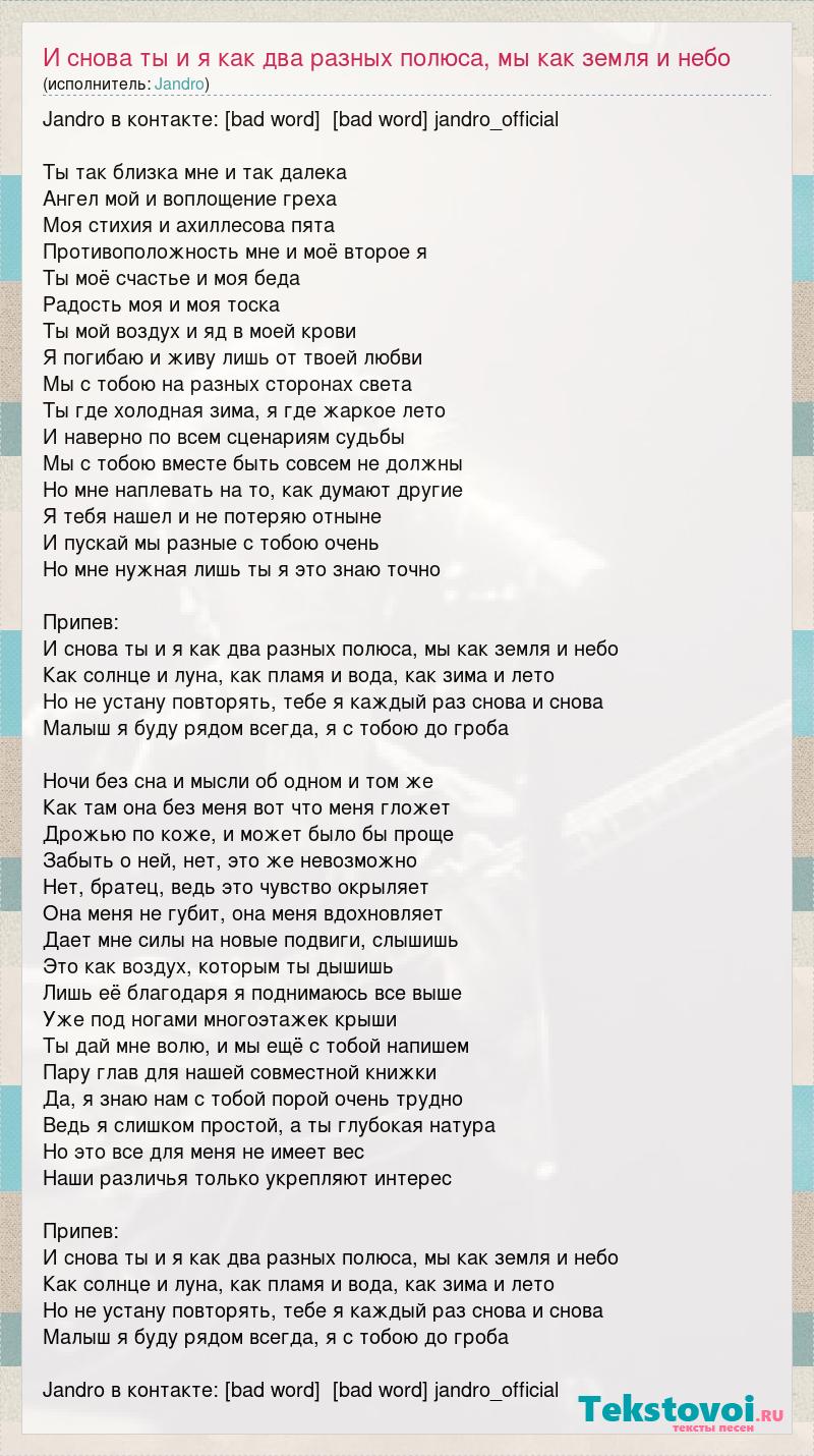 Jandro в контакте: [bad word] [bad word] jandro_official Ты так близка мне и так далека Ангел мой и воплощение греха Моя стихия и ахиллесова пята Противоположность мне и моё второе я Ты моё счастье и моя беда Радость моя и моя тоска Ты мой воздух и яд в моей крови Я погибаю и живу лишь от твоей любви Мы с тобою на разных сторонах света Ты где холодная зима, я где жаркое лето И наверно по всем сценариям судьбы Мы с тобою вместе быть совсем не должны Но мне наплевать на то, как думают другие Я тебя нашел и не потеряю отныне И пускай мы разные с тобою очень Но мне нужная лишь ты я это знаю точно Припев: И снова ты и я как два разных полюса, мы как земля и небо Как солнце и луна, как пламя и вода, как зима и лето Но не устану повторять, тебе я каждый раз снова и снова Малыш я буду рядом всегда, я с тобою до гроба Ночи без сна и мысли об одном и том же Как там она без меня вот что меня гложет Дрожью по коже, и может было бы проще Забыть о ней, нет, это же невозможно Нет, братец, ведь это чувство окрыляет Она меня не губит, она меня вдохновляет Дает мне силы на новые подвиги, слышишь Это как воздух, которым ты дышишь Лишь её благодаря я поднимаюсь все выше Уже под ногами многоэтажек крыши Ты дай мне волю, и мы ещё с тобой напишем Пару глав для нашей совместной книжки Да, я знаю нам с тобой порой очень трудно Ведь я слишком простой, а ты глубокая натура Но это все для меня не имеет вес Наши различья только укрепляют интерес Припев: И снова ты и я как два разных полюса, мы как земля и небо Как солнце и луна, как пламя и вода, как зима и лето Но не устану повторять, тебе я каждый раз снова и снова Малыш я буду рядом всегда, я с тобою до гроба Jandro в контакте: [bad word] [bad word] jandro_official