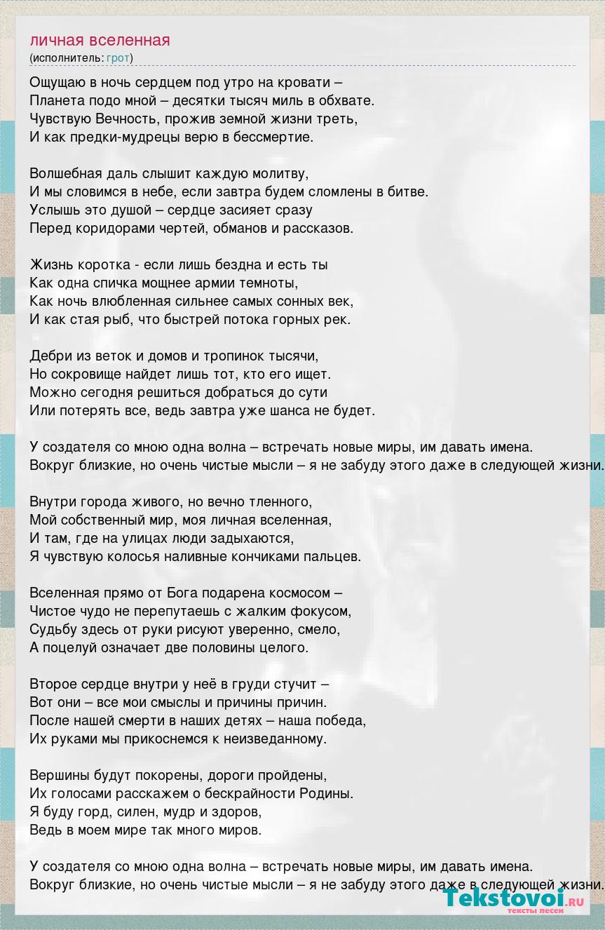 Ощущаю в ночь сердцем под утро на кровати – Планета подо мной – десятки тысяч миль в обхвате. Чувствую Вечность, прожив земной жизни треть, И как предки-мудрецы верю в бессмертие. Волшебная даль слышит каждую молитву, И мы словимся в небе, если завтра будем сломлены в битве. Услышь это душой – сердце засияет сразу Перед коридорами чертей, обманов и рассказов. Жизнь коротка - если лишь бездна и есть ты Как одна спичка мощнее армии темноты, Как ночь влюбленная сильнее самых сонных век, И как стая рыб, что быстрей потока горных рек. Дебри из веток и домов и тропинок тысячи, Но сокровище найдет лишь тот, кто его ищет. Можно сегодня решиться добраться до сути Или потерять все, ведь завтра уже шанса не будет. У создателя со мною одна волна – встречать новые миры, им давать имена. Вокруг близкие, но очень чистые мысли – я не забуду этого даже в следующей жизни. Внутри города живого, но вечно тленного, Мой собственный мир, моя личная вселенная, И там, где на улицах люди задыхаются, Я чувствую колосья наливные кончиками пальцев. Вселенная прямо от Бога подарена космосом – Чистое чудо не перепутаешь с жалким фокусом, Судьбу здесь от руки рисуют уверенно, смело, А поцелуй означает две половины целого. Второе сердце внутри у неё в груди стучит – Вот они – все мои смыслы и причины причин. После нашей смерти в наших детях – наша победа, Их руками мы прикоснемся к неизведанному. Вершины будут покорены, дороги пройдены, Их голосами расскажем о бескрайности Родины. Я буду горд, силен, мудр и здоров, Ведь в моем мире так много миров. У создателя со мною одна волна – встречать новые миры, им давать имена. Вокруг близкие, но очень чистые мысли – я не забуду этого даже в следующей жизни.