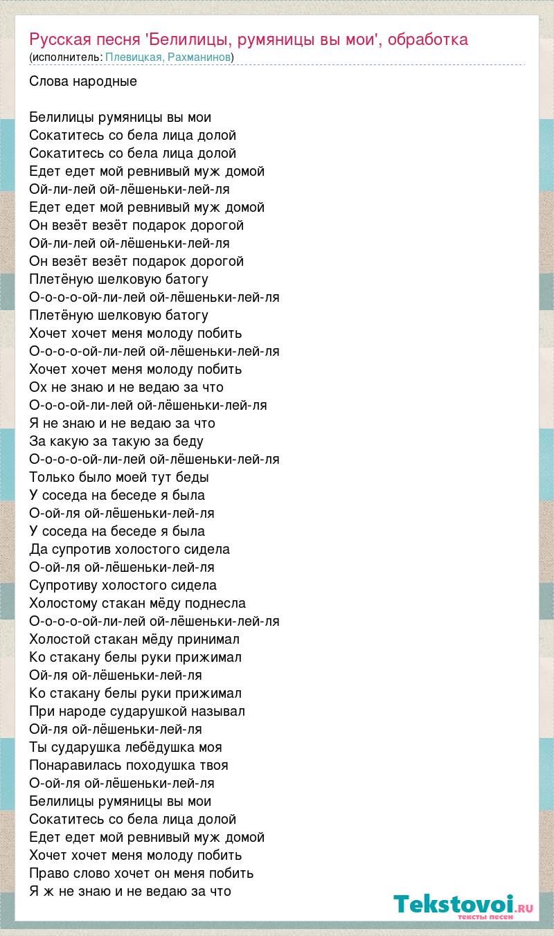 Слова народные Белилицы румяницы вы мои Сокатитесь со бела лица долой Сокатитесь со бела лица долой Едет едет мой ревнивый муж домой Ой-ли-лей ой-лёшеньки-лей-ля Едет едет мой ревнивый муж домой Он везёт везёт подарок дорогой Ой-ли-лей ой-лёшеньки-лей-ля Он везёт везёт подарок дорогой Плетёную шелковую батогу О-о-о-о-ой-ли-лей ой-лёшеньки-лей-ля Плетёную шелковую батогу Хочет хочет меня молоду побить О-о-о-о-ой-ли-лей ой-лёшеньки-лей-ля Хочет хочет меня молоду побить Ох не знаю и не ведаю за что О-о-о-ой-ли-лей ой-лёшеньки-лей-ля Я не знаю и не ведаю за что За какую за такую за беду О-о-о-о-ой-ли-лей ой-лёшеньки-лей-ля Только было моей тут беды У соседа на беседе я была О-ой-ля ой-лёшеньки-лей-ля У соседа на беседе я была Да супротив холостого сидела О-ой-ля ой-лёшеньки-лей-ля Супротиву холостого сидела Холостому стакан мёду поднесла О-о-о-о-ой-ли-лей ой-лёшеньки-лей-ля Холостой стакан мёду принимал Ко стакану белы руки прижимал Ой-ля ой-лёшеньки-лей-ля Ко стакану белы руки прижимал При народе сударушкой называл Ой-ля ой-лёшеньки-лей-ля Ты сударушка лебёдушка моя Понаравилась походушка твоя О-ой-ля ой-лёшеньки-лей-ля Белилицы румяницы вы мои Сокатитесь со бела лица долой Едет едет мой ревнивый муж домой Хочет хочет меня молоду побить Право слово хочет он меня побить Я ж не знаю и не ведаю за что