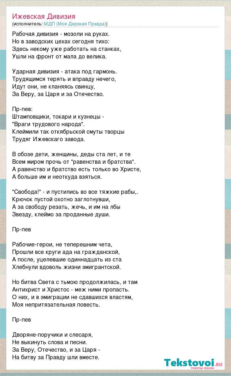 Рабочая дивизия - мозоли на руках. Но в заводских цехах сегодня тихо: Здесь некому уже работать на станках, Ушли на фронт от мала до велика. Ударная дивизия - атака под гармонь. Трудящимся терять и вправду нечего, Идут они, не кланяясь свинцу, За Веру, за Царя и за Отечество. Пр-пев: Штамповщики, токари и кузнецы - "Враги трудового народа". Клеймили так откябрьской смуты творцы Трудяг Ижевскаго завода. В обозе дети, женщины, деды ста лет, и те Всем миром прочь от "равенства и братства". А равенство и братство есть только во Христе, А больше им и неоткуда взяться. "Свобода!" - и пустились во все тяжкие рабы,. Крючок пустой охотно заглотнувши, А за свободу резать, жечь, и им на лбы Звезду, клеймо за проданные души. Пр-пев Рабочие-герои, не теперешним чета, Прошли все круги ада на гражданской, А после, уцелевшие одиннадцать из ста Хлебнули вдоволь жизни эмигрантской. Но битва Света с тьмою продолжилась, и там Антихрист и Христос - меж ними пропасть. О них, и в эмиграции не сдавшихся властям, Моя непритязательная повесть. Пр-пев Дворяне-поручики и слесаря, Не выкинуть слова и песни. За Веру, Отечество, и за Царя - На битву за Правду шли вместе.
