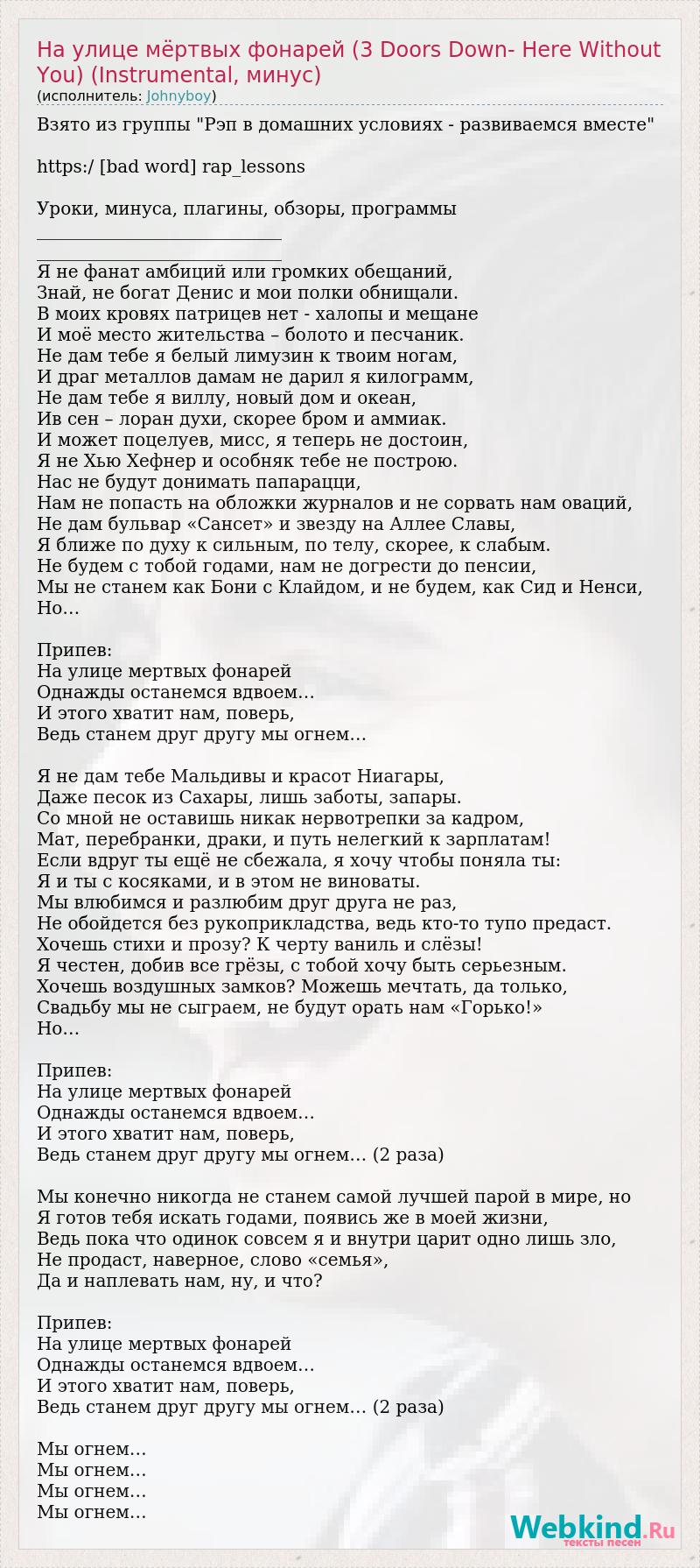 Главная→Исполнители→Johnyboy→На улице мёртвых фонарей (3 Doors Down- Here Without You) (Instrumental,
