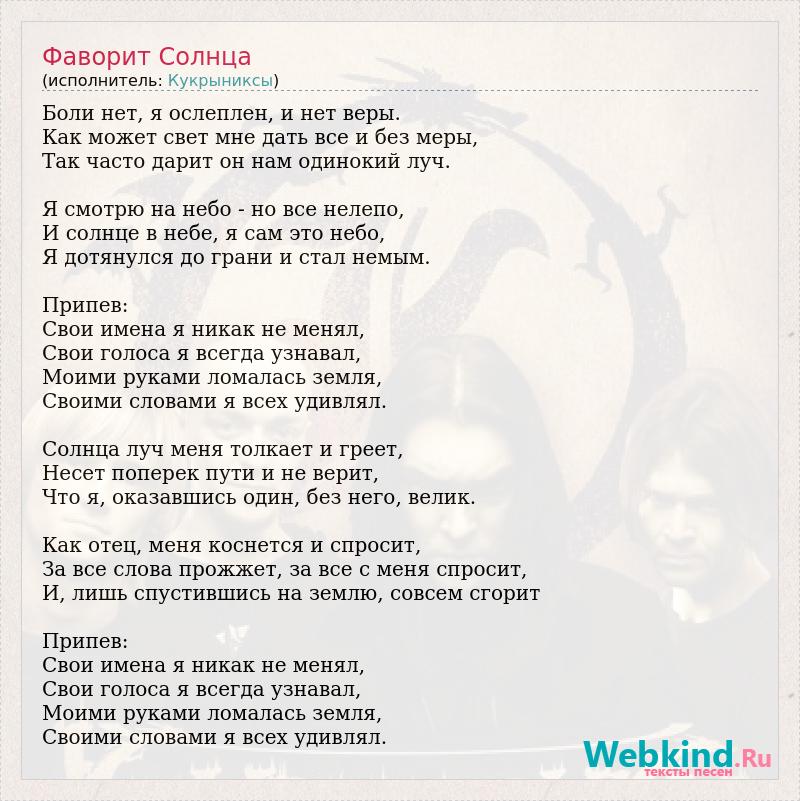 Боли нет, я ослеплен, и нет веры. Как может свет мне дать все и без меры, Так часто дарит он нам одинокий луч. Я смотрю на небо - но все нелепо, И солнце в небе, я сам это небо, Я дотянулся до грани и стал немым. Припев: Свои имена я никак не менял, Свои голоса я всегда узнавал, Моими руками ломалась земля, Своими словами я всех удивлял. Солнца луч меня толкает и греет, Несет поперек пути и не верит, Что я, оказавшись один, без него, велик. Как отец, меня коснется и спросит, За все слова прожжет, за все с меня спросит, И, лишь спустившись на землю, совсем сгорит Припев: Свои имена я никак не менял, Свои голоса я всегда узнавал, Моими руками ломалась земля, Своими словами я всех удивлял.