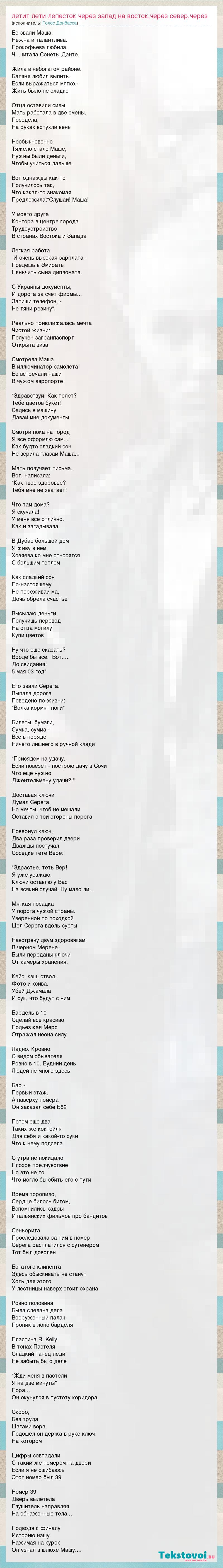 Ее звали Маша, Нежна и талантлива. Прокофьева любила, Ч...читала Сонеты Данте. Жила в небогатом районе. Батяня любил выпить. Если выражаться мягко,- Жить было не сладко Отца оставили силы, Мать работала в две смены. Поседела, На руках вспухли вены Необыкновенно Тяжело стало Маше, Нужны были деньги, Чтобы учиться дальше. Вот однажды как-то Получилось так, Что какая-то знакомая Предложила:"Слушай! Маша! У моего друга Контора в центре города. Трудоустройство В странах Востока и Запада Легкая работа И очень высокая зарплата - Поедешь в Эмираты Няньчить сына дипломата. С Украины документы, И дорога за счет фирмы... Запиши телефон, - Не тяни резину". Реально приюлижалась мечта Чистой жизни: Получен загранпаспорт Открыта виза Смотрела Маша В иллюминатор самолета: Ее встречали наши В чужом аэропорте "Здравствуй! Как полет? Тебе цветов букет! Садись в машину Давай мне документы Смотри пока на город Я все оформлю сам..." Как будто сладкий сон Не верила глазам Маша... Мать получает письма. Вот, написала: "Как твое здоровье? Тебя мне не хватает! Что там дома? Я скучала! У меня все отлично. Как и загадывала. В Дубае большой дом Я живу в нем. Хозяева ко мне относятся С большим теплом Как сладкий сон По-настоящему Не переживай ма, Дочь обрела счастье Высылаю деньги. Получишь перевод На отца могилу Купи цветов Ну что еще сказать? Вроде бы все. Вот.... До свидания! 5 мая 03 год" Его звали Серега. Выпала дорога Поведено по-жизни: "Волка кормят ноги" Билеты, бумаги, Сумка, сумма - Все в поряде Ничего лишнего в ручной клади "Присядем на удачу. Если повезет - построю дачу в Сочи Что еще нужно Джентельмену удачи?!" Доставая ключи Думал Серега, Но мечты, чтоб не мешали Оставил с той стороны порога Повернул ключ, Два раза проверил двери Дважды постучал Соседке тете Вере: "Здрастье, теть Вер! Я уже уезжаю. Ключи оставлю у Вас На всякий случай. Ну мало ли... Мягкая посадка У порога чужой страны. Уверенной по походкой Шел Серега вдоль суеты Навстречу двум здоровякам В черном Мерене. Были переданы ключи От камеры хранения. Кейс, кэш, ствол, Фото и ксива. Убей Джамала И сук, что будут с ним Бардель в 10 Сделай все красиво Подьезжая Мерс Отражал неона силу Ладно. Кровно. С видом обывателя Ровно в 10. Будний день Людей не много здесь Бар - Первый этаж, А наверху номера Он заказал себе Б52 Потом еще два Таких же коктейля Для себя и какой-то суки Что к нему подсела С утра не покидало Плохое предчувствие Но это не то Что могло бы сбить его с пути Время торопило, Сердце билось битом, Вспомнились кадры Итальянских фильмов про бандитов Сеньорита Проследовала за ним в номер Серега расплатился с сутенером Тот был доволен Богатого клинента Здесь обыскивать не станут Хоть для этого У лестницы наверх стоит охрана Ровно половина Была сделана дела Вооруженный палач Проник в лоно барделя Пластина R. Kelly В тонах Пастеля Сладкий танец леди Не забыть бы о деле "Жди меня в пастели Я на две минуты" Пора... Он окунулся в пустоту коридора Скоро, Без труда Шагами вора Подошел он держа в руке ключ На котором Цифры совпадали С таким же номером на двери Если я не ошибаюсь Этот номер был 39 Номер 39 Дверь вылетела Глушитель направляя На обнаженные тела... Подводя к финалу Историю нашу Нажимая на курок Он узнал в шлюхе Машу....