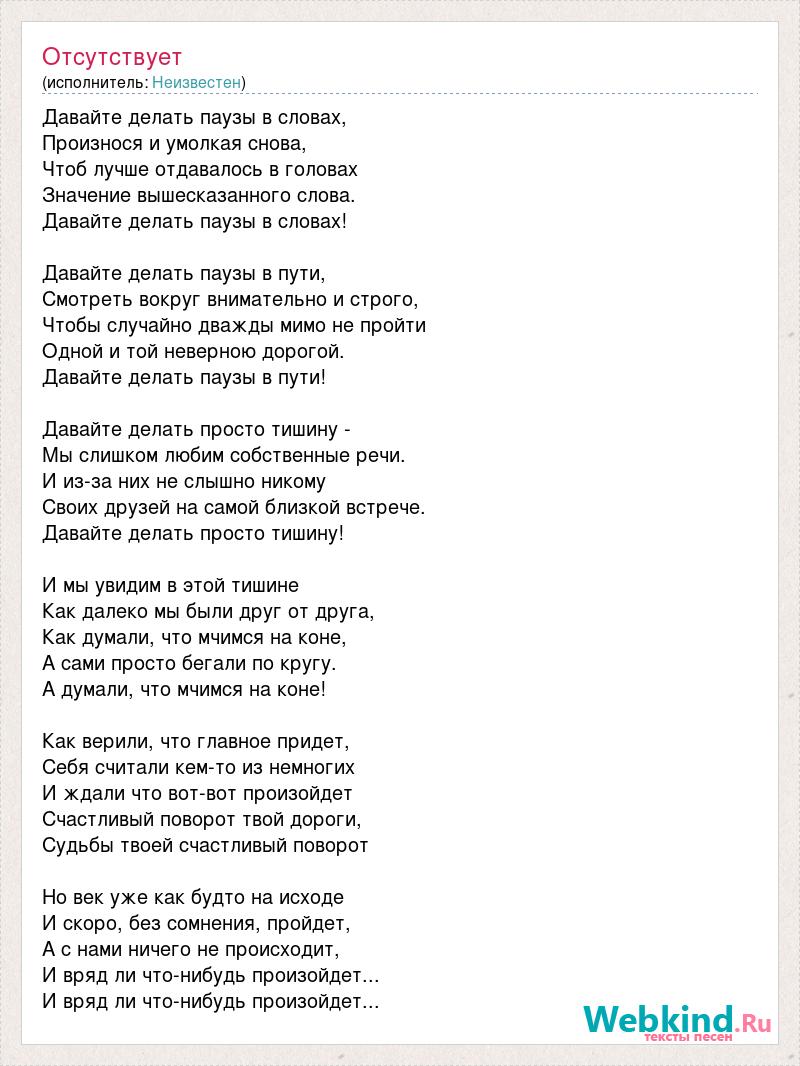 Давайте делать паузы в словах, Произнося и умолкая снова, Чтоб лучше отдавалось в головах Значение вышесказанного слова. Давайте делать паузы в словах! Давайте делать паузы в пути, Смотреть вокруг внимательно и строго, Чтобы случайно дважды мимо не пройти Одной и той неверною дорогой. Давайте делать паузы в пути! Давайте делать просто тишину - Мы слишком любим собственные речи. И из-за них не слышно никому Своих друзей на самой близкой встрече. Давайте делать просто тишину! И мы увидим в этой тишине Как далеко мы были друг от друга, Как думали, что мчимся на коне, А сами просто бегали по кругу. А думали, что мчимся на коне! Как верили, что главное придет, Себя считали кем-то из немногих И ждали что вот-вот произойдет Счастливый поворот твой дороги, Судьбы твоей счастливый поворот Но век уже как будто на исходе И скоро, без сомнения, пройдет, А с нами ничего не происходит, И вряд ли что-нибудь произойдет... И вряд ли что-нибудь произойдет...