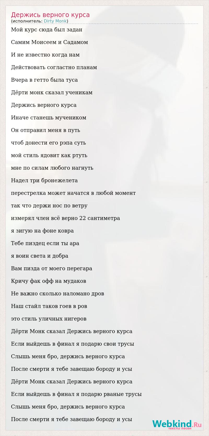 Мой курс сюда был задан Самим Моисеем и Садамом И не известно когда нам Действовать согластно планам Вчера в гетто была туса Дёрти монк сказал ученикам Держись верного курса Иначе станешь мучеником Он отправил меня в путь чтоб донести его рэпа суть мой стиль ядовит как ртуть мне по силам любого нагнуть Надел три бронежелета перестрелка может начатся в любой момент так что держи нос по ветру измерял член всё верно 22 сантиметра я зигую на фоне ковра Тебе пиздец если ты ара я воин света и добра Вам пизда от моего перегара Кричу фак офф на мудаков Не важно сколько наломано дров Наш стайл таков гоев в ров это стиль уличных нигеров Дёрти Монк сказал Держись верного курса Если выйдешь в финал я подарю свои трусы Слышь меня бро, держись верного курса После смерти я тебе завещаю бороду и усы Дёрти Монк сказал Держись верного курса Если выйдешь в финал я подарю рваные трусы Слышь меня бро, держись верного курса После смерти я тебе завещаю бороду и усы