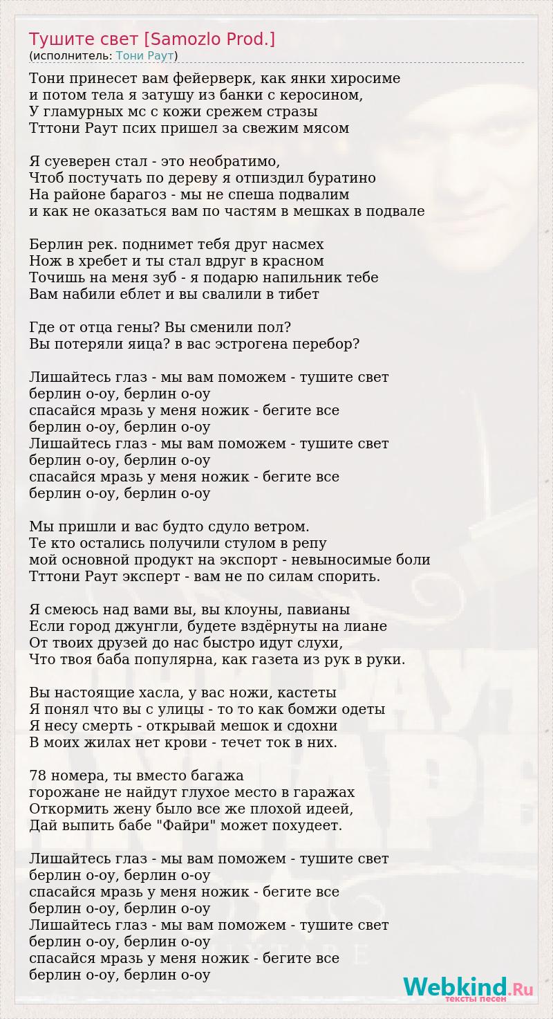 Тони принесет вам фейерверк, как янки хиросиме и потом тела я затушу из банки с керосином, У гламурных мс с кожи срежем стразы Тттони Раут псих пришел за свежим мясом Я суеверен стал - это необратимо, Чтоб постучать по дереву я отпиздил буратино На районе барагоз - мы не спеша подвалим и как не оказаться вам по частям в мешках в подвале Берлин рек. поднимет тебя друг насмех Нож в хребет и ты стал вдруг в красном Точишь на меня зуб - я подарю напильник тебе Вам набили еблет и вы свалили в тибет Где от отца гены? Вы сменили пол? Вы потеряли яица? в вас эстрогена перебор? Лишайтесь глаз - мы вам поможем - тушите свет берлин о-оу, берлин о-оу спасайся мразь у меня ножик - бегите все берлин о-оу, берлин о-оу Лишайтесь глаз - мы вам поможем - тушите свет берлин о-оу, берлин о-оу спасайся мразь у меня ножик - бегите все берлин о-оу, берлин о-оу Мы пришли и вас будто сдуло ветром. Те кто остались получили стулом в репу мой основной продукт на экспорт - невыносимые боли Тттони Раут эксперт - вам не по силам спорить. Я смеюсь над вами вы, вы клоуны, павианы Если город джунгли, будете вздёрнуты на лиане От твоих друзей до нас быстро идут слухи, Что твоя баба популярна, как газета из рук в руки. Вы настоящие хасла, у вас ножи, кастеты Я понял что вы с улицы - то то как бомжи одеты Я несу смерть - открывай мешок и сдохни В моих жилах нет крови - течет ток в них. 78 номера, ты вместо багажа горожане не найдут глухое место в гаражах Откормить жену было все же плохой идеей, Дай выпить бабе "Файри" может похудеет. Лишайтесь глаз - мы вам поможем - тушите свет берлин о-оу, берлин о-оу спасайся мразь у меня ножик - бегите все берлин о-оу, берлин о-оу Лишайтесь глаз - мы вам поможем - тушите свет берлин о-оу, берлин о-оу спасайся мразь у меня ножик - бегите все берлин о-оу, берлин о-оу