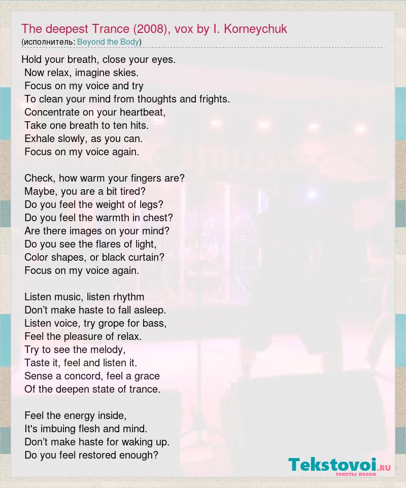 Hold your breath, close your eyes. Now relax, imagine skies. Focus on my voice and try To clean your mind from thoughts and frights. Concentrate on your heartbeat, Take one breath to ten hits. Exhale slowly, as you can. Focus on my voice again. Check, how warm your fingers are? Maybe, you are a bit tired? Do you feel the weight of legs? Do you feel the warmth in chest? Are there images on your mind? Do you see the flares of light, Color shapes, or black curtain? Focus on my voice again. Listen music, listen rhythm Don’t make haste to fall asleep. Listen voice, try grope for bass, Feel the pleasure of relax. Try to see the melody, Taste it, feel and listen it. Sense a concord, feel a grace Of the deepen state of trance. Feel the energy inside, It's imbuing flesh and mind. Don’t make haste for waking up. Do you feel restored enough?