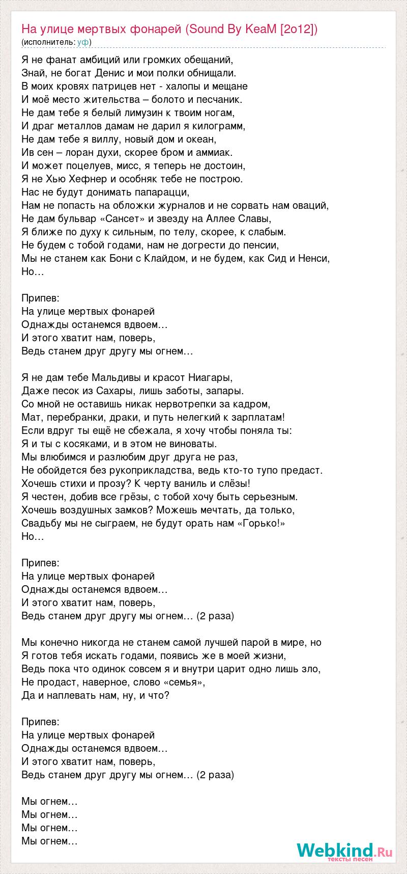 Я не фанат амбиций или громких обещаний, Знай, не богат Денис и мои полки обнищали. В моих кровях патрицев нет - халопы и мещане И моё место жительства – болото и песчаник. Не дам тебе я белый лимузин к твоим ногам, И драг металлов дамам не дарил я килограмм, Не дам тебе я виллу, новый дом и океан, Ив сен – лоран духи, скорее бром и аммиак. И может поцелуев, мисс, я теперь не достоин, Я не Хью Хефнер и особняк тебе не построю. Нас не будут донимать папарацци, Нам не попасть на обложки журналов и не сорвать нам оваций, Не дам бульвар «Сансет» и звезду на Аллее Славы, Я ближе по духу к сильным, по телу, скорее, к слабым. Не будем с тобой годами, нам не догрести до пенсии, Мы не станем как Бони с Клайдом, и не будем, как Сид и Ненси, Но… Припев: На улице мертвых фонарей Однажды останемся вдвоем… И этого хватит нам, поверь, Ведь станем друг другу мы огнем… Я не дам тебе Мальдивы и красот Ниагары, Даже песок из Сахары, лишь заботы, запары. Со мной не оставишь никак нервотрепки за кадром, Мат, перебранки, драки, и путь нелегкий к зарплатам! Если вдруг ты ещё не сбежала, я хочу чтобы поняла ты: Я и ты с косяками, и в этом не виноваты. Мы влюбимся и разлюбим друг друга не раз, Не обойдется без рукоприкладства, ведь кто-то тупо предаст. Хочешь стихи и прозу? К черту ваниль и слёзы! Я честен, добив все грёзы, с тобой хочу быть серьезным. Хочешь воздушных замков? Можешь мечтать, да только, Свадьбу мы не сыграем, не будут орать нам «Горько!» Но… Припев: На улице мертвых фонарей Однажды останемся вдвоем… И этого хватит нам, поверь, Ведь станем друг другу мы огнем… (2 раза) Мы конечно никогда не станем самой лучшей парой в мире, но Я готов тебя искать годами, появись же в моей жизни, Ведь пока что одинок совсем я и внутри царит одно лишь зло, Не продаст, наверное, слово «семья», Да и наплевать нам, ну, и что? Припев: На улице мертвых фонарей Однажды останемся вдвоем… И этого хватит нам, поверь, Ведь станем друг другу мы огнем… (2 раза) Мы огнем… Мы огнем… Мы огнем… Мы огнем…
