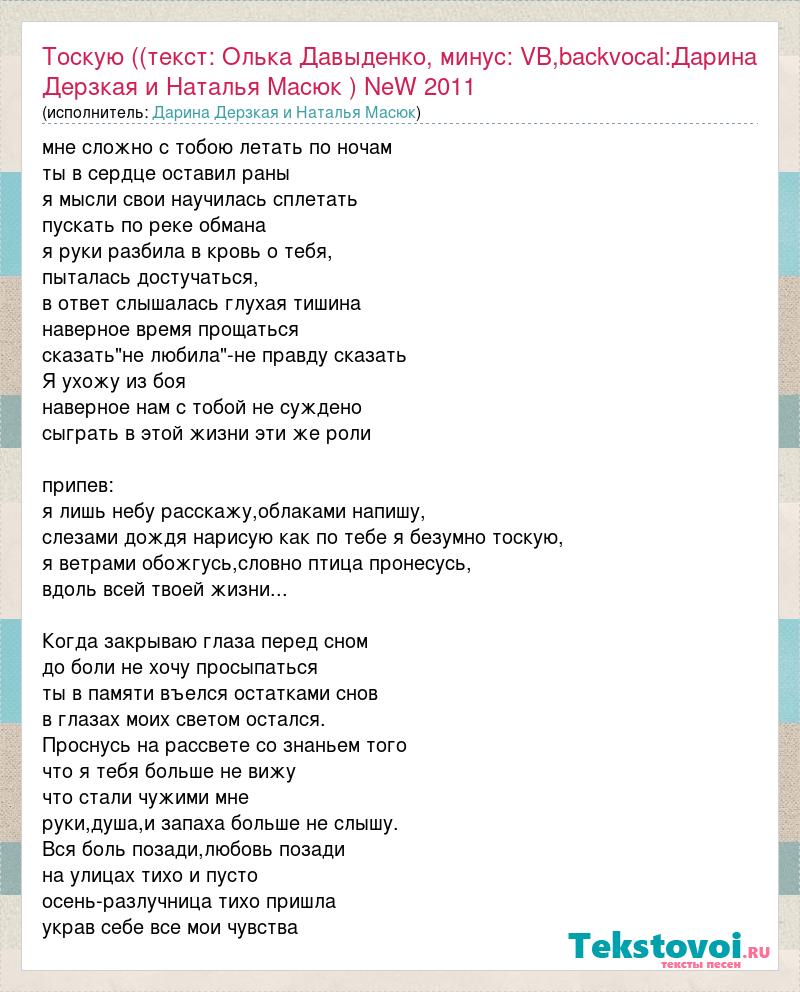 Главная→Исполнители→Дарина Дерзкая и Наталья Масюк→Тоскую ((текст: Олька Давыденко, минус: VB,backvocal:Дарина Дерзкая и Наталья Ма