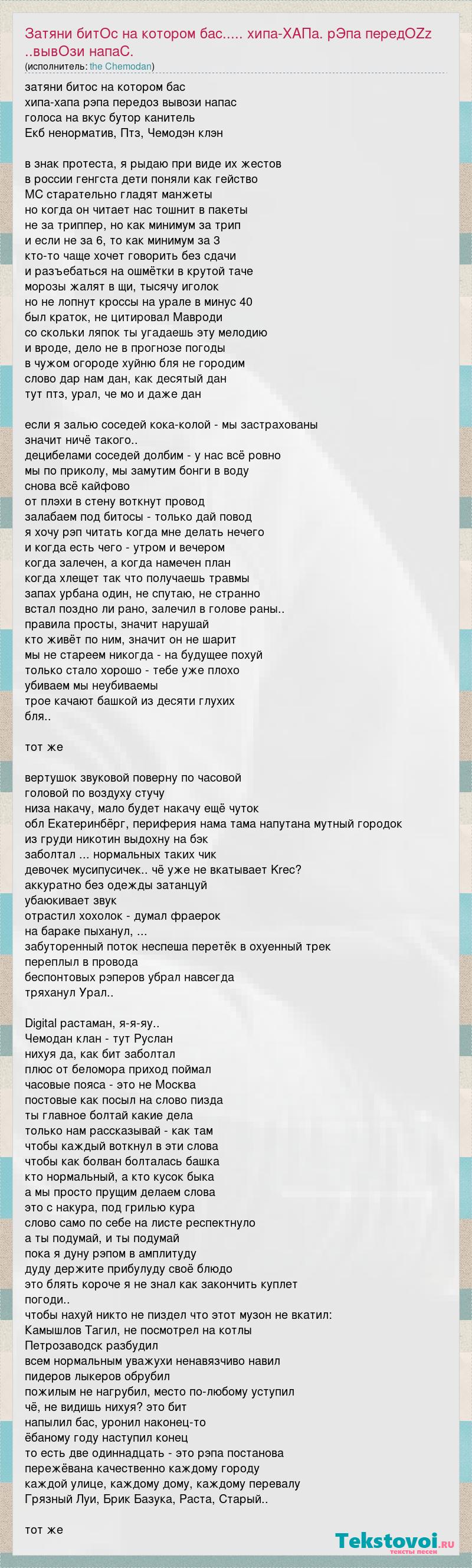 затяни битос на котором бас хипа-хапа рэпа передоз вывози напас голоса на вкус бутор канитель Екб ненорматив, Птз, Чемодэн клэн в знак протеста, я рыдаю при виде их жестов в россии генгста дети поняли как гейство МС старательно гладят манжеты но когда он читает нас тошнит в пакеты не за триппер, но как минимум за трип и если не за 6, то как минимум за 3 кто-то чаще хочет говорить без сдачи и разъебаться на ошмётки в крутой таче морозы жалят в щи, тысячу иголок но не лопнут кроссы на урале в минус 40 был краток, не цитировал Мавроди со скольки ляпок ты угадаешь эту мелодию и вроде, дело не в прогнозе погоды в чужом огороде хуйню бля не городим слово дар нам дан, как десятый дан тут птз, урал, че мо и даже дан если я залью соседей кока-колой - мы застрахованы значит ничё такого.. децибелами соседей долбим - у нас всё ровно мы по приколу, мы замутим бонги в воду снова всё кайфово от плэхи в стену воткнут провод залабаем под битосы - только дай повод я хочу рэп читать когда мне делать нечего и когда есть чего - утром и вечером когда залечен, а когда намечен план когда хлещет так что получаешь травмы запах урбана один, не спутаю, не странно встал поздно ли рано, залечил в голове раны.. правила просты, значит нарушай кто живёт по ним, значит он не шарит мы не стареем никогда - на будущее похуй только стало хорошо - тебе уже плохо убиваем мы неубиваемы трое качают башкой из десяти глухих бля.. тот же вертушок звуковой поверну по часовой головой по воздуху стучу низа накачу, мало будет накачу ещё чуток обл Екатеринбёрг, периферия нама тама напутана мутный городок из груди никотин выдохну на бэк заболтал ... нормальных таких чик девочек мусипусичек.. чё уже не вкатывает Krec? аккуратно без одежды затанцуй убаюкивает звук отрастил хохолок - думал фраерок на бараке пыханул, ... забуторенный поток неспеша перетёк в охуенный трек переплыл в провода беспонтовых рэперов убрал навсегда тряханул Урал.. Digital растаман, я-я-яу.. Чемодан клан - тут Руслан нихуя да, как бит заболтал плюс от беломора приход поймал часовые пояса - это не Москва постовые как посыл на слово пизда ты главное болтай какие дела только нам рассказывай - как там чтобы каждый воткнул в эти слова чтобы как болван болталась башка кто нормальный, а кто кусок быка а мы просто прущим делаем слова это с накура, под грилью кура слово само по себе на листе респектнуло а ты подумай, и ты подумай пока я дуну рэпом в амплитуду дуду держите прибулуду своё блюдо это блять короче я не знал как закончить куплет погоди.. чтобы нахуй никто не пиздел что этот музон не вкатил: Камышлов Тагил, не посмотрел на котлы Петрозаводск разбудил всем нормальным уважухи ненавязчиво навил пидеров лыкеров обрубил пожилым не нагрубил, место по-любому уступил чё, не видишь нихуя? это бит напылил бас, уронил наконец-то ёбаному году наступил конец то есть две одиннадцать - это рэпа постанова пережёвана качественно каждому городу каждой улице, каждому дому, каждому перевалу Грязный Луи, Брик Базука, Раста, Старый.. тот же