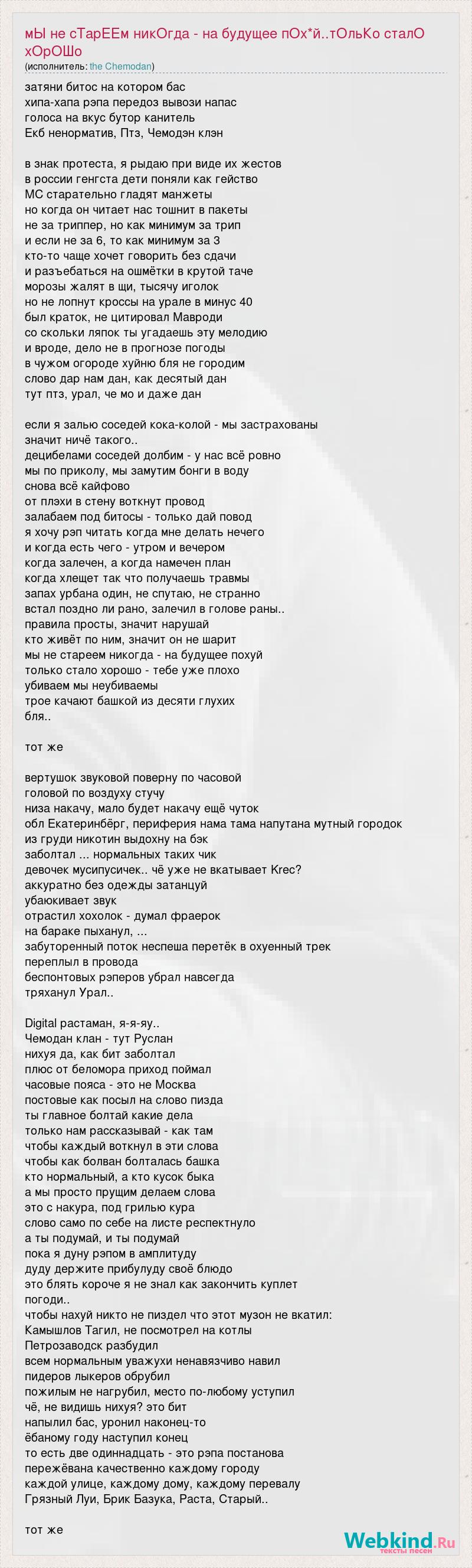 затяни битос на котором бас хипа-хапа рэпа передоз вывози напас голоса на вкус бутор канитель Екб ненорматив, Птз, Чемодэн клэн в знак протеста, я рыдаю при виде их жестов в россии генгста дети поняли как гейство МС старательно гладят манжеты но когда он читает нас тошнит в пакеты не за триппер, но как минимум за трип и если не за 6, то как минимум за 3 кто-то чаще хочет говорить без сдачи и разъебаться на ошмётки в крутой таче морозы жалят в щи, тысячу иголок но не лопнут кроссы на урале в минус 40 был краток, не цитировал Мавроди со скольки ляпок ты угадаешь эту мелодию и вроде, дело не в прогнозе погоды в чужом огороде хуйню бля не городим слово дар нам дан, как десятый дан тут птз, урал, че мо и даже дан если я залью соседей кока-колой - мы застрахованы значит ничё такого.. децибелами соседей долбим - у нас всё ровно мы по приколу, мы замутим бонги в воду снова всё кайфово от плэхи в стену воткнут провод залабаем под битосы - только дай повод я хочу рэп читать когда мне делать нечего и когда есть чего - утром и вечером когда залечен, а когда намечен план когда хлещет так что получаешь травмы запах урбана один, не спутаю, не странно встал поздно ли рано, залечил в голове раны.. правила просты, значит нарушай кто живёт по ним, значит он не шарит мы не стареем никогда - на будущее похуй только стало хорошо - тебе уже плохо убиваем мы неубиваемы трое качают башкой из десяти глухих бля.. тот же вертушок звуковой поверну по часовой головой по воздуху стучу низа накачу, мало будет накачу ещё чуток обл Екатеринбёрг, периферия нама тама напутана мутный городок из груди никотин выдохну на бэк заболтал ... нормальных таких чик девочек мусипусичек.. чё уже не вкатывает Krec? аккуратно без одежды затанцуй убаюкивает звук отрастил хохолок - думал фраерок на бараке пыханул, ... забуторенный поток неспеша перетёк в охуенный трек переплыл в провода беспонтовых рэперов убрал навсегда тряханул Урал.. Digital растаман, я-я-яу.. Чемодан клан - тут Руслан нихуя да, как бит заболтал плюс от беломора приход поймал часовые пояса - это не Москва постовые как посыл на слово пизда ты главное болтай какие дела только нам рассказывай - как там чтобы каждый воткнул в эти слова чтобы как болван болталась башка кто нормальный, а кто кусок быка а мы просто прущим делаем слова это с накура, под грилью кура слово само по себе на листе респектнуло а ты подумай, и ты подумай пока я дуну рэпом в амплитуду дуду держите прибулуду своё блюдо это блять короче я не знал как закончить куплет погоди.. чтобы нахуй никто не пиздел что этот музон не вкатил: Камышлов Тагил, не посмотрел на котлы Петрозаводск разбудил всем нормальным уважухи ненавязчиво навил пидеров лыкеров обрубил пожилым не нагрубил, место по-любому уступил чё, не видишь нихуя? это бит напылил бас, уронил наконец-то ёбаному году наступил конец то есть две одиннадцать - это рэпа постанова пережёвана качественно каждому городу каждой улице, каждому дому, каждому перевалу Грязный Луи, Брик Базука, Раста, Старый.. тот же