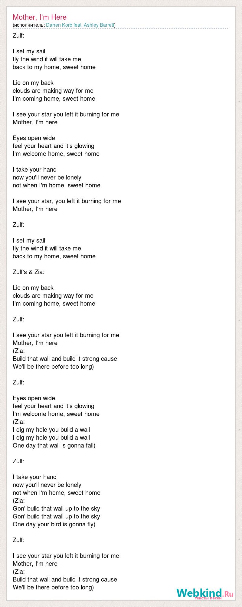 Zulf: I set my sail fly the wind it will take me back to my home, sweet home Lie on my back clouds are making way for me I'm coming home, sweet home I see your star you left it burning for me Mother, I'm here Eyes open wide feel your heart and it's glowing I'm welcome home, sweet home I take your hand now you'll never be lonely not when I'm home, sweet home I see your star, you left it burning for me Mother, I'm here Zulf: I set my sail fly the wind it will take me back to my home, sweet home Zulf's & Zia: Lie on my back clouds are making way for me I'm coming home, sweet home Zulf: I see your star you left it burning for me Mother, I'm here (Zia: Build that wall and build it strong cause We'll be there before too long) Zulf: Eyes open wide feel your heart and it's glowing I'm welcome home, sweet home (Zia: I dig my hole you build a wall I dig my hole you build a wall One day that wall is gonna fall) Zulf: I take your hand now you'll never be lonely not when I'm home, sweet home (Zia: Gon' build that wall up to the sky Gon' build that wall up to the sky One day your bird is gonna fly) Zulf: I see your star you left it burning for me Mother, I'm here (Zia: Build that wall and build it strong cause We'll be there before too long)