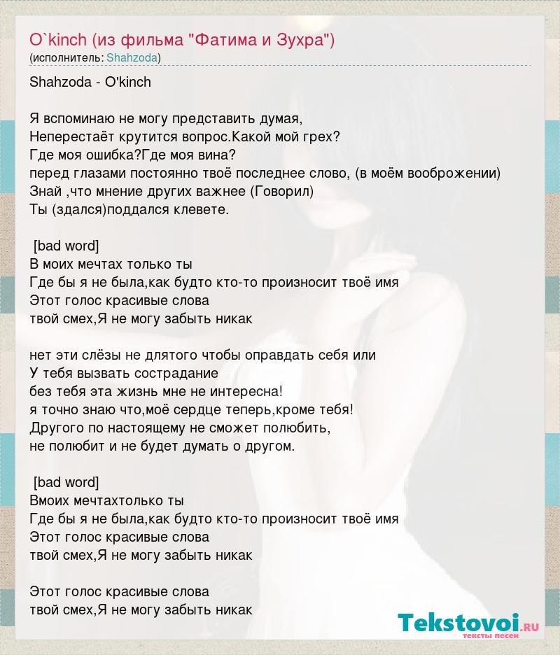 Shahzoda - O'kinch Я вспоминаю не могу представить думая, Неперестаёт крутится вопрос.Какой мой грех? Где моя ошибка?Где моя вина? перед глазами постоянно твоё последнее слово, (в моём вооброжении) Знай ,что мнение других важнее (Говорил) Ты (здался)поддался клевете. [bad word] В моих мечтах только ты Где бы я не была,как будто кто-то произносит твоё имя Этот голос красивые слова твой смех,Я не могу забыть никак нет эти слёзы не длятого чтобы оправдать себя или У тебя вызвать сострадание без тебя эта жизнь мне не интересна! я точно знаю что,моё сердце теперь,кроме тебя! Другого по настоящему не сможет полюбить, не полюбит и не будет думать о другом. [bad word] Вмоих мечтахтолько ты Где бы я не была,как будто кто-то произносит твоё имя Этот голос красивые слова твой смех,Я не могу забыть никак Этот голос красивые слова твой смех,Я не могу забыть никак