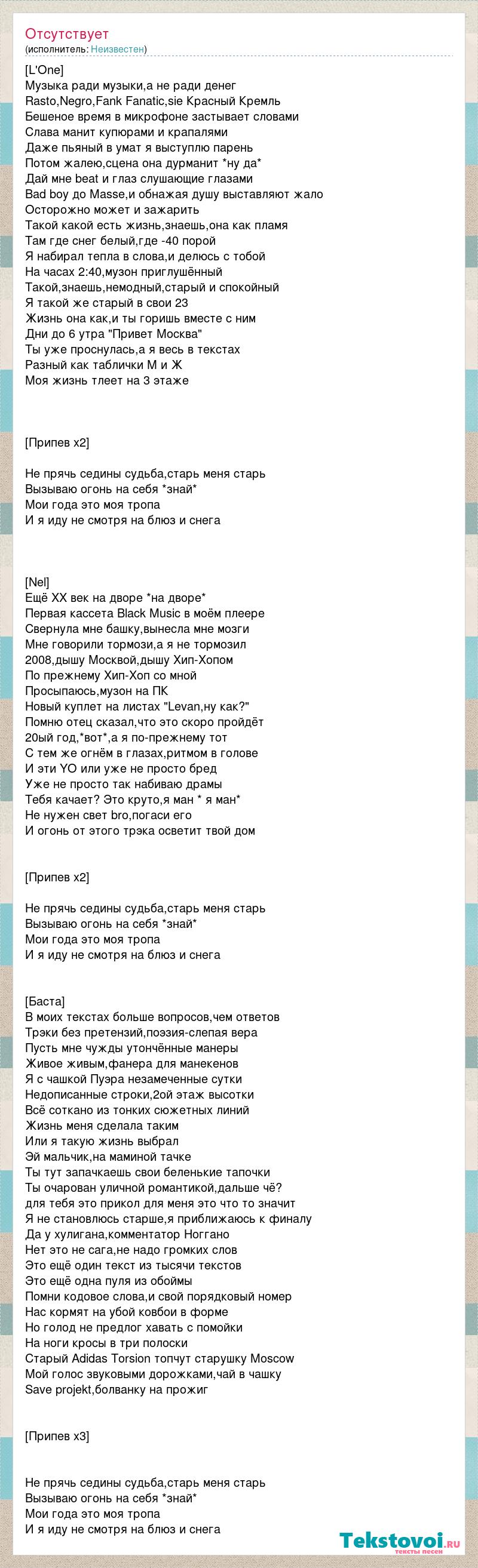 [L'One] Музыка ради музыки,а не ради денег Rasto,Negro,Fank Fanatic,sie Красный Кремль Бешеное время в микрофоне застывает словами Слава манит купюрами и крапалями Даже пьяный в умат я выступлю парень Потом жалею,сцена она дурманит *ну да* Дай мне beat и глаз слушающие глазами Bad boy до Masse,и обнажая душу выставляют жало Осторожно может и зажарить Такой какой есть жизнь,знаешь,она как пламя Там где снег белый,где -40 порой Я набирал тепла в слова,и делюсь с тобой На часах 2:40,музон приглушённый Такой,знаешь,немодный,старый и спокойный Я такой же старый в свои 23 Жизнь она как,и ты горишь вместе с ним Дни до 6 утра "Привет Москва" Ты уже проснулась,а я весь в текстах Разный как таблички М и Ж Моя жизнь тлеет на 3 этаже [Припев х2] Не прячь седины судьба,старь меня старь Вызываю огонь на себя *знай* Мои года это моя тропа И я иду не смотря на блюз и снега [Nel] Ещё XX век на дворе *на дворе* Первая кассета Black Music в моём плеере Свернула мне башку,вынесла мне мозги Мне говорили тормози,а я не тормозил 2008,дышу Москвой,дышу Хип-Хопом По прежнему Хип-Хоп со мной Просыпаюсь,музон на ПК Новый куплет на листах "Levan,ну как?" Помню отец сказал,что это скоро пройдёт 20ый год,*вот*,а я по-прежнему тот С тем же огнём в глазах,ритмом в голове И эти YO или уже не просто бред Уже не просто так набиваю драмы Тебя качает? Это круто,я ман * я ман* Не нужен свет brо,погаси его И огонь от этого трэка осветит твой дом [Припев х2] Не прячь седины судьба,старь меня старь Вызываю огонь на себя *знай* Мои года это моя тропа И я иду не смотря на блюз и снега [Баста] В моих текстах больше вопросов,чем ответов Трэки без претензий,поэзия-слепая вера Пусть мне чужды утончённые манеры Живое живым,фанера для манекенов Я с чашкой Пуэра незамеченные сутки Недописанные строки,2ой этаж высотки Всё соткано из тонких сюжетных линий Жизнь меня сделала таким Или я такую жизнь выбрал Эй мальчик,на маминой тачке Ты тут запачкаешь свои беленькие тапочки Ты очарован уличной романтикой,дальше чё? для тебя это прикол для меня это что то значит Я не становлюсь старше,я приближаюсь к финалу Да у хулигана,комментатор Ноггано Нет это не сага,не надо громких слов Это ещё один текст из тысячи текстов Это ещё одна пуля из обоймы Помни кодовое слова,и свой порядковый номер Нас кормят на убой ковбои в форме Но голод не предлог хавать с помойки На ноги кросы в три полоски Старый Adidas Torsion топчут старушку Moscow Мой голос звуковыми дорожками,чай в чашку Save projekt,болванку на прожиг [Припев х3] Не прячь седины судьба,старь меня старь Вызываю огонь на себя *знай* Мои года это моя тропа И я иду не смотря на блюз и снега