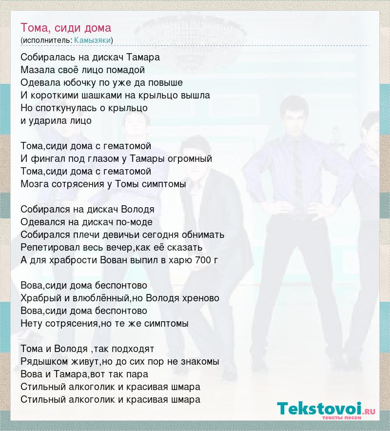Собиралась на дискач Тамара Мазала своё лицо помадой Одевала юбочку по уже да повыше И короткими шашками на крыльцо вышла Но споткунулась о крыльцо и ударила лицо Тома,сиди дома с гематомой И фингал под глазом у Тамары огромный Тома,сиди дома с гематомой Мозга сотрясения у Томы симптомы Собирался на дискач Володя Одевался на дискач по-моде Собирался плечи девичьи сегодня обнимать Репетировал весь вечер,как её сказать А для храбрости Вован выпил в харю 700 г Вова,сиди дома беспонтово Храбрый и влюблённый,но Володя хреново Вова,сиди дома беспонтово Нету сотрясения,но те же симптомы Тома и Володя ,так подходят Рядышком живут,но до сих пор не знакомы Вова и Тамара,вот так пара Стильный алкоголик и красивая шмара Стильный алкоголик и красивая шмара