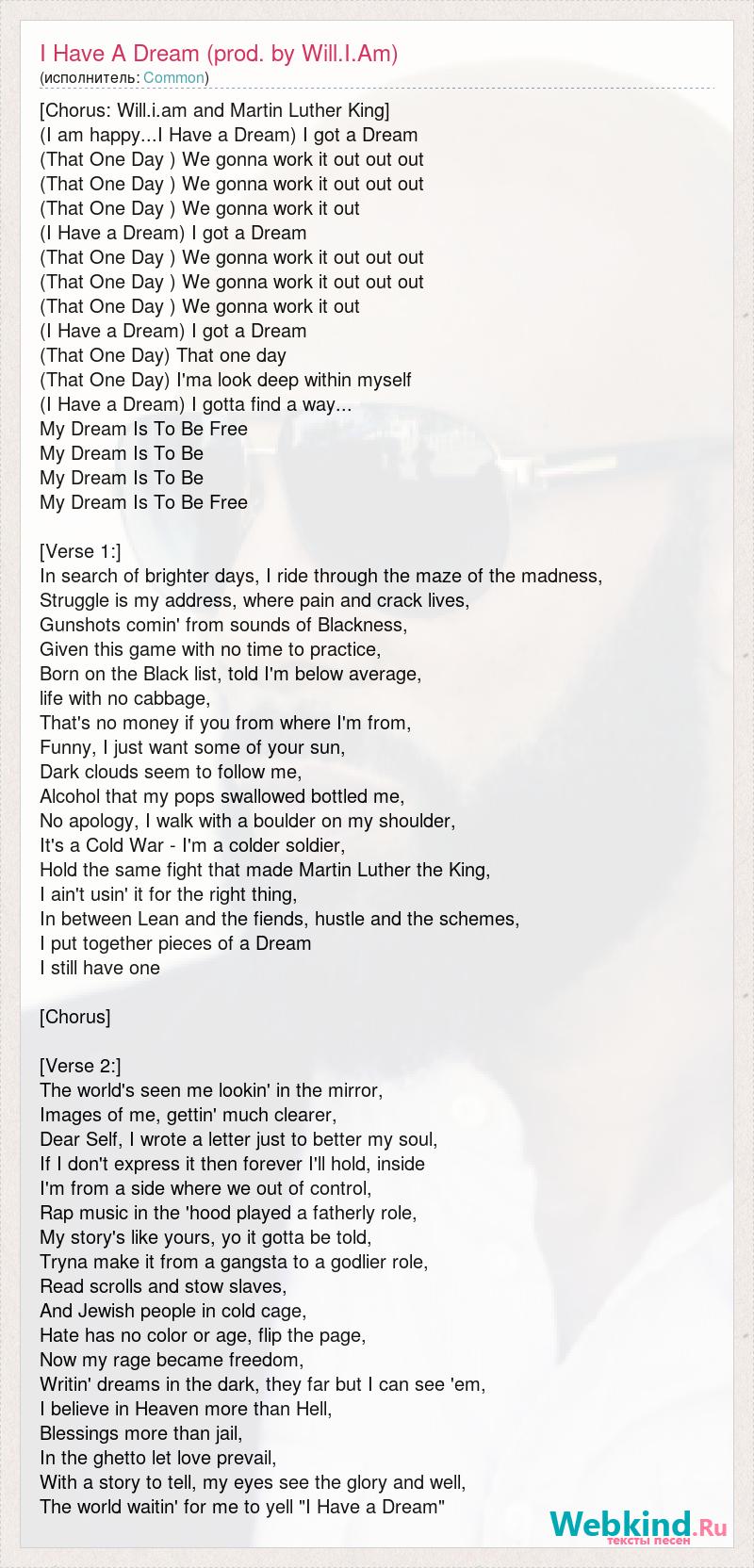 [Chorus: Will.i.am and Martin Luther King] (I am happy...I Have a Dream) I got a Dream (That One Day ) We gonna work it out out out (That One Day ) We gonna work it out out out (That One Day ) We gonna work it out (I Have a Dream) I got a Dream (That One Day ) We gonna work it out out out (That One Day ) We gonna work it out out out (That One Day ) We gonna work it out (I Have a Dream) I got a Dream (That One Day) That one day (That One Day) I'ma look deep within myself (I Have a Dream) I gotta find a way... My Dream Is To Be Free My Dream Is To Be My Dream Is To Be My Dream Is To Be Free [Verse 1:] In search of brighter days, I ride through the maze of the madness, Struggle is my address, where pain and crack lives, Gunshots comin' from sounds of Blackness, Given this game with no time to practice, Born on the Black list, told I'm below average, life with no cabbage, That's no money if you from where I'm from, Funny, I just want some of your sun, Dark clouds seem to follow me, Alcohol that my pops swallowed bottled me, No apology, I walk with a boulder on my shoulder, It's a Cold War - I'm a colder soldier, Hold the same fight that made Martin Luther the King, I ain't usin' it for the right thing, In between Lean and the fiends, hustle and the schemes, I put together pieces of a Dream I still have one [Chorus] [Verse 2:] The world's seen me lookin' in the mirror, Images of me, gettin' much clearer, Dear Self, I wrote a letter just to better my soul, If I don't express it then forever I'll hold, inside I'm from a side where we out of control, Rap music in the 'hood played a fatherly role, My story's like yours, yo it gotta be told, Tryna make it from a gangsta to a godlier role, Read scrolls and stow slaves, And Jewish people in cold cage, Hate has no color or age, flip the page, Now my rage became freedom, Writin' dreams in the dark, they far but I can see 'em, I believe in Heaven more than Hell, Blessings more than jail, In the ghetto let love prevail, With a story to tell, my eyes see the glory and well, The world waitin' for me to yell "I Have a Dream"