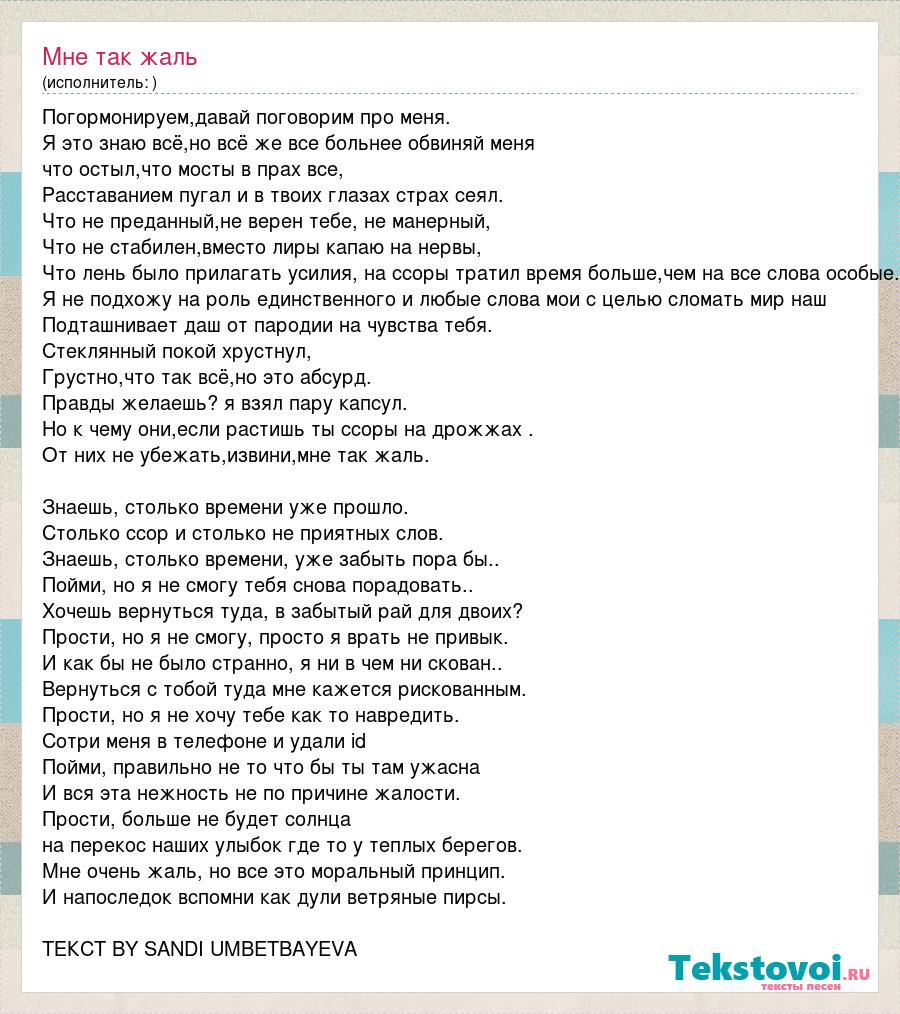Погормонируем,давай поговорим про меня. Я это знаю всё,но всё же все больнее обвиняй меня что остыл,что мосты в прах все, Расставанием пугал и в твоих глазах страх сеял. Что не преданный,не верен тебе, не манерный, Что не стабилен,вместо лиры капаю на нервы, Что лень было прилагать усилия, на ссоры тратил время больше,чем на все слова особые. Я не подхожу на роль единственного и любые слова мои с целью сломать мир наш Подташнивает даш от пародии на чувства тебя. Стеклянный покой хрустнул, Грустно,что так всё,но это абсурд. Правды желаешь? я взял пару капсул. Но к чему они,если растишь ты ссоры на дрожжах . От них не убежать,извини,мне так жаль. Знаешь, столько времени уже прошло. Столько ссор и столько не приятных слов. Знаешь, столько времени, уже забыть пора бы.. Пойми, но я не смогу тебя снова порадовать.. Хочешь вернуться туда, в забытый рай для двоих? Прости, но я не смогу, просто я врать не привык. И как бы не было странно, я ни в чем ни скован.. Вернуться с тобой туда мне кажется рискованным. Прости, но я не хочу тебе как то навредить. Сотри меня в телефоне и удали id Пойми, правильно не то что бы ты там ужасна И вся эта нежность не по причине жалости. Прости, больше не будет солнца на перекос наших улыбок где то у теплых берегов. Мне очень жаль, но все это моральный принцип. И напоследок вспомни как дули ветряные пирсы. ТЕКСТ BY SANDI UMBETBAYEVA