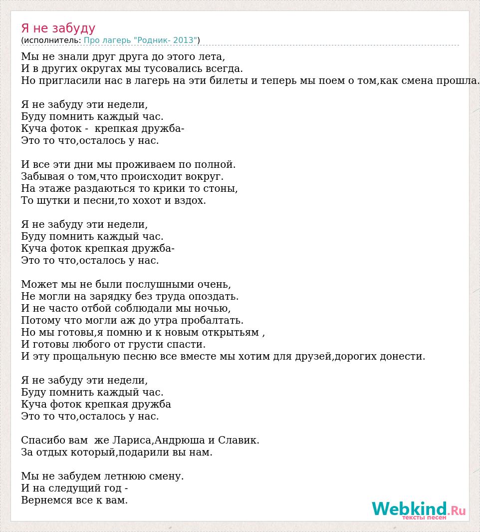 Мы не знали друг друга до этого лета, И в других округах мы тусовались всегда. Но пригласили нас в лагерь на эти билеты и теперь мы поем о том,как смена прошла. Я не забуду эти недели, Буду помнить каждый час. Куча фоток - крепкая дружба- Это то что,осталось у нас. И все эти дни мы проживаем по полной. Забывая о том,что происходит вокруг. На этаже раздаються то крики то стоны, То шутки и песни,то хохот и вздох. Я не забуду эти недели, Буду помнить каждый час. Куча фоток крепкая дружба- Это то что,осталось у нас. Может мы не были послушными очень, Не могли на зарядку без труда опоздать. И не часто отбой соблюдали мы ночью, Потому что могли аж до утра пробалтать. Но мы готовы,я помню и к новым открытьям , И готовы любого от грусти спасти. И эту прощальную песню все вместе мы хотим для друзей,дорогих донести. Я не забуду эти недели, Буду помнить каждый час. Куча фоток крепкая дружба Это то что,осталось у нас. Спасибо вам же Лариса,Андрюша и Славик. За отдых который,подарили вы нам. Мы не забудем летнюю смену. И на следущий год - Вернемся все к вам.