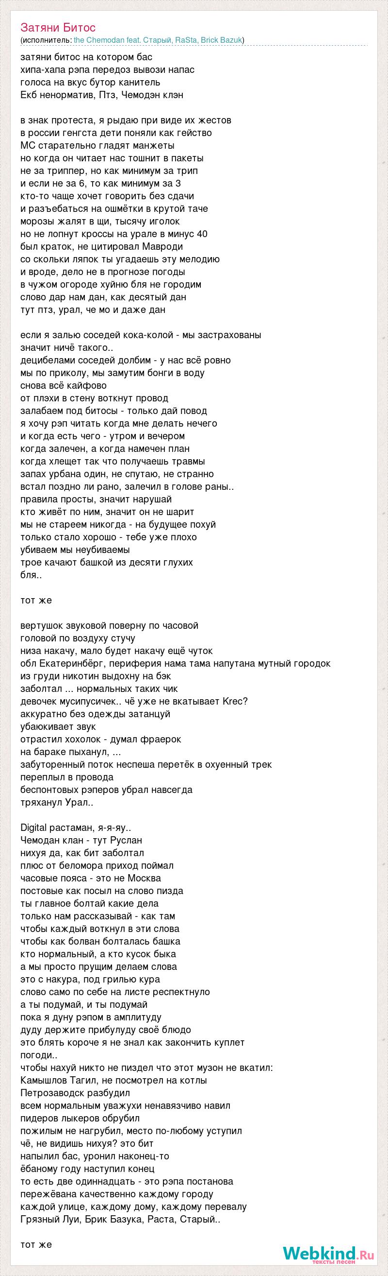 затяни битос на котором бас хипа-хапа рэпа передоз вывози напас голоса на вкус бутор канитель Екб ненорматив, Птз, Чемодэн клэн в знак протеста, я рыдаю при виде их жестов в россии генгста дети поняли как гейство МС старательно гладят манжеты но когда он читает нас тошнит в пакеты не за триппер, но как минимум за трип и если не за 6, то как минимум за 3 кто-то чаще хочет говорить без сдачи и разъебаться на ошмётки в крутой таче морозы жалят в щи, тысячу иголок но не лопнут кроссы на урале в минус 40 был краток, не цитировал Мавроди со скольки ляпок ты угадаешь эту мелодию и вроде, дело не в прогнозе погоды в чужом огороде хуйню бля не городим слово дар нам дан, как десятый дан тут птз, урал, че мо и даже дан если я залью соседей кока-колой - мы застрахованы значит ничё такого.. децибелами соседей долбим - у нас всё ровно мы по приколу, мы замутим бонги в воду снова всё кайфово от плэхи в стену воткнут провод залабаем под битосы - только дай повод я хочу рэп читать когда мне делать нечего и когда есть чего - утром и вечером когда залечен, а когда намечен план когда хлещет так что получаешь травмы запах урбана один, не спутаю, не странно встал поздно ли рано, залечил в голове раны.. правила просты, значит нарушай кто живёт по ним, значит он не шарит мы не стареем никогда - на будущее похуй только стало хорошо - тебе уже плохо убиваем мы неубиваемы трое качают башкой из десяти глухих бля.. тот же вертушок звуковой поверну по часовой головой по воздуху стучу низа накачу, мало будет накачу ещё чуток обл Екатеринбёрг, периферия нама тама напутана мутный городок из груди никотин выдохну на бэк заболтал ... нормальных таких чик девочек мусипусичек.. чё уже не вкатывает Krec? аккуратно без одежды затанцуй убаюкивает звук отрастил хохолок - думал фраерок на бараке пыханул, ... забуторенный поток неспеша перетёк в охуенный трек переплыл в провода беспонтовых рэперов убрал навсегда тряханул Урал.. Digital растаман, я-я-яу.. Чемодан клан - тут Руслан нихуя да, как бит заболтал плюс от беломора приход поймал часовые пояса - это не Москва постовые как посыл на слово пизда ты главное болтай какие дела только нам рассказывай - как там чтобы каждый воткнул в эти слова чтобы как болван болталась башка кто нормальный, а кто кусок быка а мы просто прущим делаем слова это с накура, под грилью кура слово само по себе на листе респектнуло а ты подумай, и ты подумай пока я дуну рэпом в амплитуду дуду держите прибулуду своё блюдо это блять короче я не знал как закончить куплет погоди.. чтобы нахуй никто не пиздел что этот музон не вкатил: Камышлов Тагил, не посмотрел на котлы Петрозаводск разбудил всем нормальным уважухи ненавязчиво навил пидеров лыкеров обрубил пожилым не нагрубил, место по-любому уступил чё, не видишь нихуя? это бит напылил бас, уронил наконец-то ёбаному году наступил конец то есть две одиннадцать - это рэпа постанова пережёвана качественно каждому городу каждой улице, каждому дому, каждому перевалу Грязный Луи, Брик Базука, Раста, Старый.. тот же