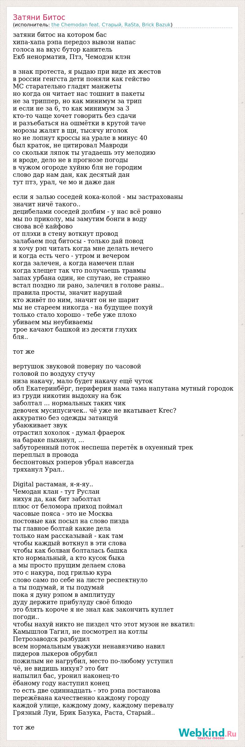затяни битос на котором бас хипа-хапа рэпа передоз вывози напас голоса на вкус бутор канитель Екб ненорматив, Птз, Чемодэн клэн в знак протеста, я рыдаю при виде их жестов в россии генгста дети поняли как гейство МС старательно гладят манжеты но когда он читает нас тошнит в пакеты не за триппер, но как минимум за трип и если не за 6, то как минимум за 3 кто-то чаще хочет говорить без сдачи и разъебаться на ошмётки в крутой таче морозы жалят в щи, тысячу иголок но не лопнут кроссы на урале в минус 40 был краток, не цитировал Мавроди со скольки ляпок ты угадаешь эту мелодию и вроде, дело не в прогнозе погоды в чужом огороде хуйню бля не городим слово дар нам дан, как десятый дан тут птз, урал, че мо и даже дан если я залью соседей кока-колой - мы застрахованы значит ничё такого.. децибелами соседей долбим - у нас всё ровно мы по приколу, мы замутим бонги в воду снова всё кайфово от плэхи в стену воткнут провод залабаем под битосы - только дай повод я хочу рэп читать когда мне делать нечего и когда есть чего - утром и вечером когда залечен, а когда намечен план когда хлещет так что получаешь травмы запах урбана один, не спутаю, не странно встал поздно ли рано, залечил в голове раны.. правила просты, значит нарушай кто живёт по ним, значит он не шарит мы не стареем никогда - на будущее похуй только стало хорошо - тебе уже плохо убиваем мы неубиваемы трое качают башкой из десяти глухих бля.. тот же вертушок звуковой поверну по часовой головой по воздуху стучу низа накачу, мало будет накачу ещё чуток обл Екатеринбёрг, периферия нама тама напутана мутный городок из груди никотин выдохну на бэк заболтал ... нормальных таких чик девочек мусипусичек.. чё уже не вкатывает Krec? аккуратно без одежды затанцуй убаюкивает звук отрастил хохолок - думал фраерок на бараке пыханул, ... забуторенный поток неспеша перетёк в охуенный трек переплыл в провода беспонтовых рэперов убрал навсегда тряханул Урал.. Digital растаман, я-я-яу.. Чемодан клан - тут Руслан нихуя да, как бит заболтал плюс от беломора приход поймал часовые пояса - это не Москва постовые как посыл на слово пизда ты главное болтай какие дела только нам рассказывай - как там чтобы каждый воткнул в эти слова чтобы как болван болталась башка кто нормальный, а кто кусок быка а мы просто прущим делаем слова это с накура, под грилью кура слово само по себе на листе респектнуло а ты подумай, и ты подумай пока я дуну рэпом в амплитуду дуду держите прибулуду своё блюдо это блять короче я не знал как закончить куплет погоди.. чтобы нахуй никто не пиздел что этот музон не вкатил: Камышлов Тагил, не посмотрел на котлы Петрозаводск разбудил всем нормальным уважухи ненавязчиво навил пидеров лыкеров обрубил пожилым не нагрубил, место по-любому уступил чё, не видишь нихуя? это бит напылил бас, уронил наконец-то ёбаному году наступил конец то есть две одиннадцать - это рэпа постанова пережёвана качественно каждому городу каждой улице, каждому дому, каждому перевалу Грязный Луи, Брик Базука, Раста, Старый.. тот же