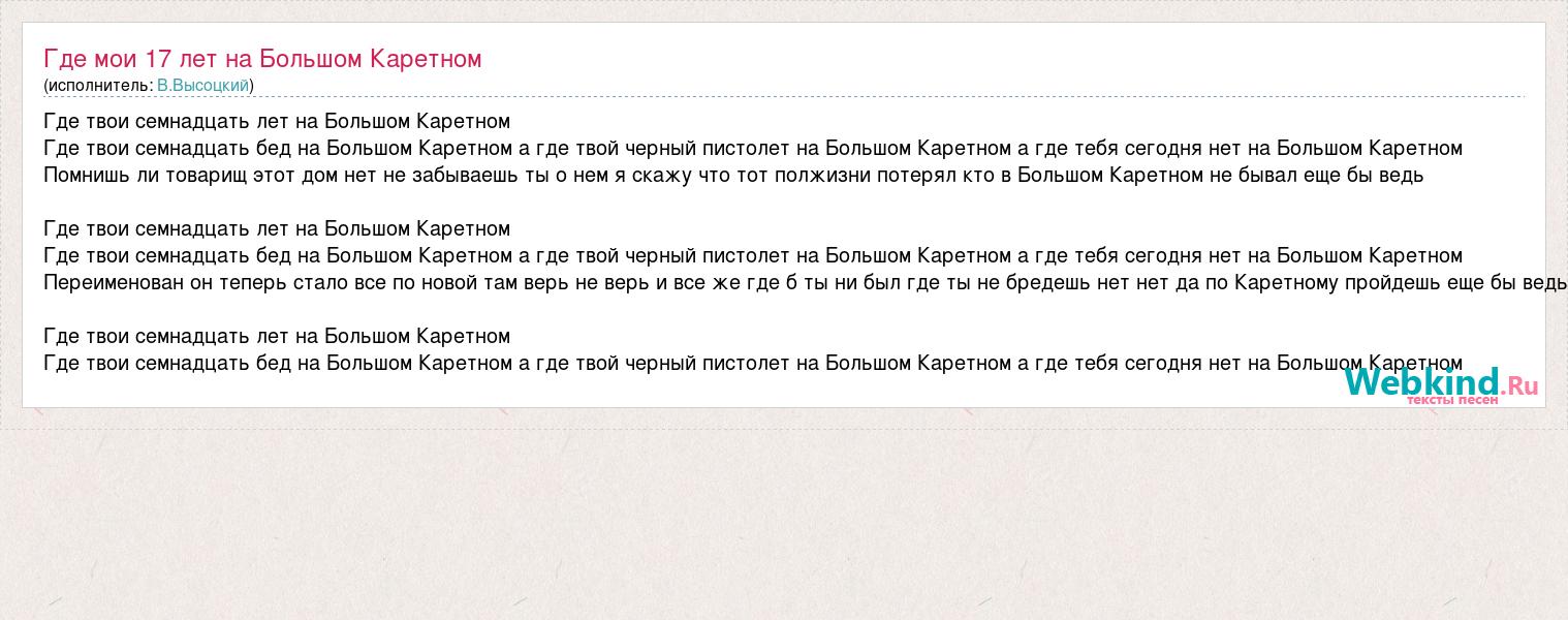 Где твои семнадцать лет на Большом Каретном Где твои семнадцать бед на Большом Каретном а где твой черный пистолет на Большом Каретном а где тебя сегодня нет на Большом Каретном Помнишь ли товарищ этот дом нет не забываешь ты о нем я скажу что тот полжизни потерял кто в Большом Каретном не бывал еще бы ведь Где твои семнадцать лет на Большом Каретном Где твои семнадцать бед на Большом Каретном а где твой черный пистолет на Большом Каретном а где тебя сегодня нет на Большом Каретном Переименован он теперь стало все по новой там верь не верь и все же где б ты ни был где ты не бредешь нет нет да по Каретному пройдешь еще бы ведь Где твои семнадцать лет на Большом Каретном Где твои семнадцать бед на Большом Каретном а где твой черный пистолет на Большом Каретном а где тебя сегодня нет на Большом Каретном
