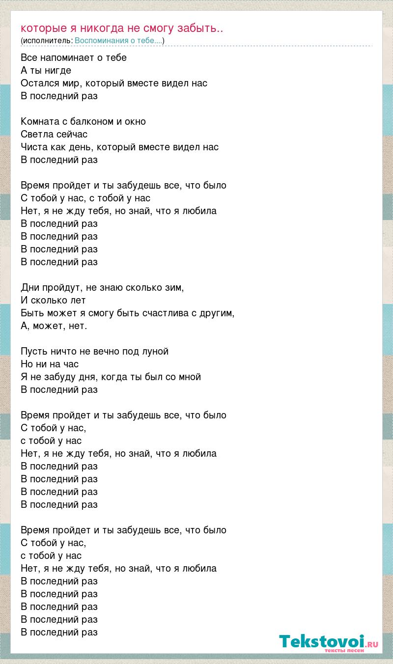 Все напоминает о тебе А ты нигде Остался мир, который вместе видел нас В последний раз Комната с балконом и окно Светла сейчас Чиста как день, который вместе видел нас В последний раз Время пройдет и ты забудешь все, что было С тобой у нас, с тобой у нас Нет, я не жду тебя, но знай, что я любила В последний раз В последний раз В последний раз В последний раз Дни пройдут, не знаю сколько зим, И сколько лет Быть может я смогу быть счастлива с другим, А, может, нет. Пусть ничто не вечно под луной Но ни на час Я не забуду дня, когда ты был со мной В последний раз Время пройдет и ты забудешь все, что было С тобой у нас, с тобой у нас Нет, я не жду тебя, но знай, что я любила В последний раз В последний раз В последний раз В последний раз Время пройдет и ты забудешь все, что было С тобой у нас, с тобой у нас Нет, я не жду тебя, но знай, что я любила В последний раз В последний раз В последний раз В последний раз В последний раз