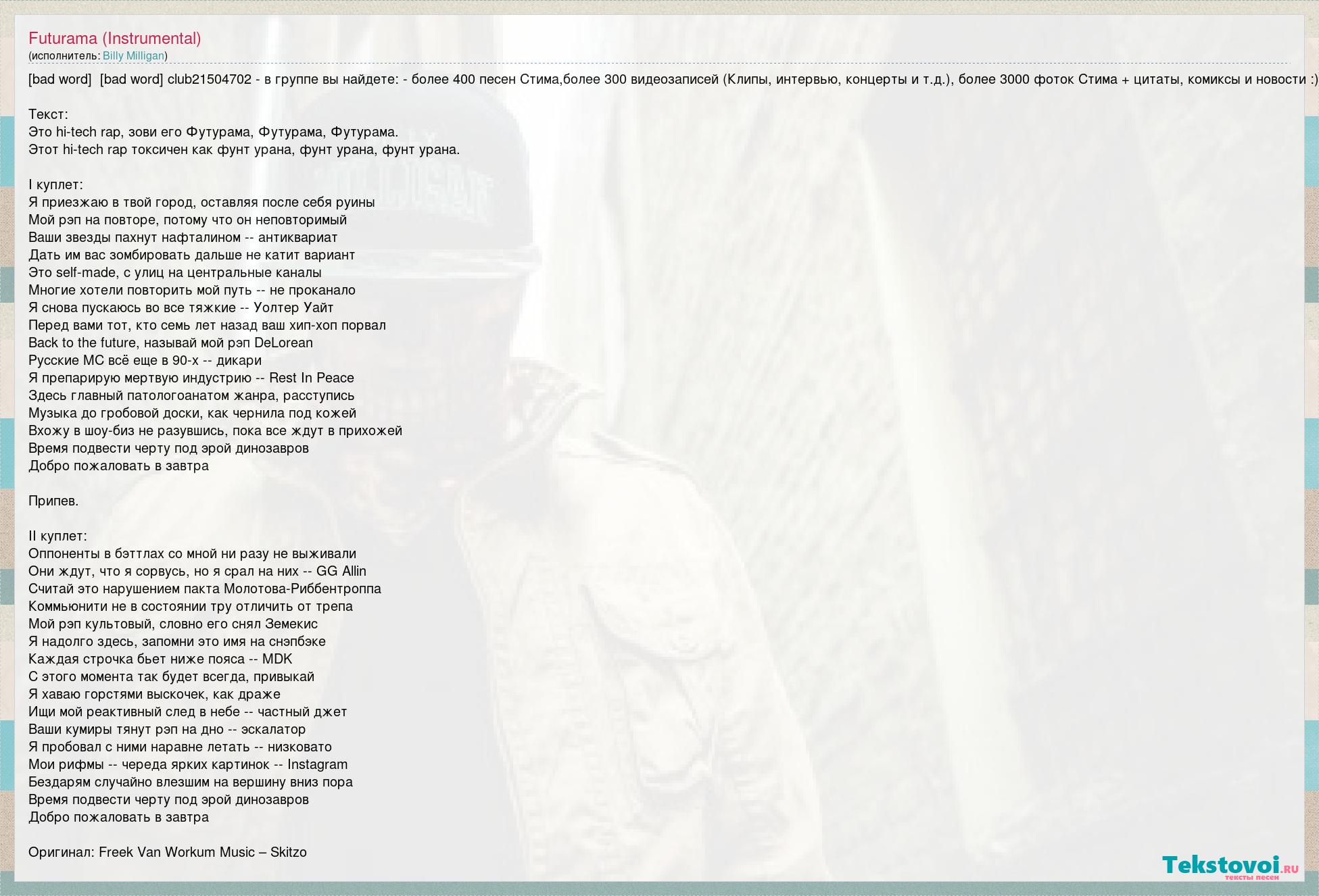 [bad word] [bad word] club21504702 - в группе вы найдете: - более 400 песен Стима,более 300 видеозаписей (Клипы, интервью, концерты и т.д.), более 3000 фоток Стима + цитаты, комиксы и новости :) Текст: Это hi-tech rap, зови его Футурама, Футурама, Футурама. Этот hi-tech rap токсичен как фунт урана, фунт урана, фунт урана. I куплет: Я приезжаю в твой город, оставляя после себя руины Мой рэп на повторе, потому что он неповторимый Ваши звезды пахнут нафталином -- антиквариат Дать им вас зомбировать дальше не катит вариант Это self-made, с улиц на центральные каналы Многие хотели повторить мой путь -- не проканало Я снова пускаюсь во все тяжкие -- Уолтер Уайт Перед вами тот, кто семь лет назад ваш хип-хоп порвал Back to the future, называй мой рэп DeLorean Русские MC всё еще в 90-х -- дикари Я препарирую мертвую индустрию -- Rest In Peace Здесь главный патологоанатом жанра, расступись Музыка до гробовой доски, как чернила под кожей Вхожу в шоу-биз не разувшись, пока все ждут в прихожей Время подвести черту под эрой динозавров Добро пожаловать в завтра Припев. II куплет: Оппоненты в бэттлах со мной ни разу не выживали Они ждут, что я сорвусь, но я срал на них -- GG Allin Считай это нарушением пакта Молотова-Риббентроппа Коммьюнити не в состоянии тру отличить от трепа Мой рэп культовый, словно его снял Земекис Я надолго здесь, запомни это имя на снэпбэке Каждая строчка бьет ниже пояса -- MDK С этого момента так будет всегда, привыкай Я хаваю горстями выскочек, как драже Ищи мой реактивный след в небе -- частный джет Ваши кумиры тянут рэп на дно -- эскалатор Я пробовал с ними наравне летать -- низковато Мои рифмы -- череда ярких картинок -- Instagram Бездарям случайно влезшим на вершину вниз пора Время подвести черту под эрой динозавров Добро пожаловать в завтра Оригинал: Freek Van Workum Music – Skitzo