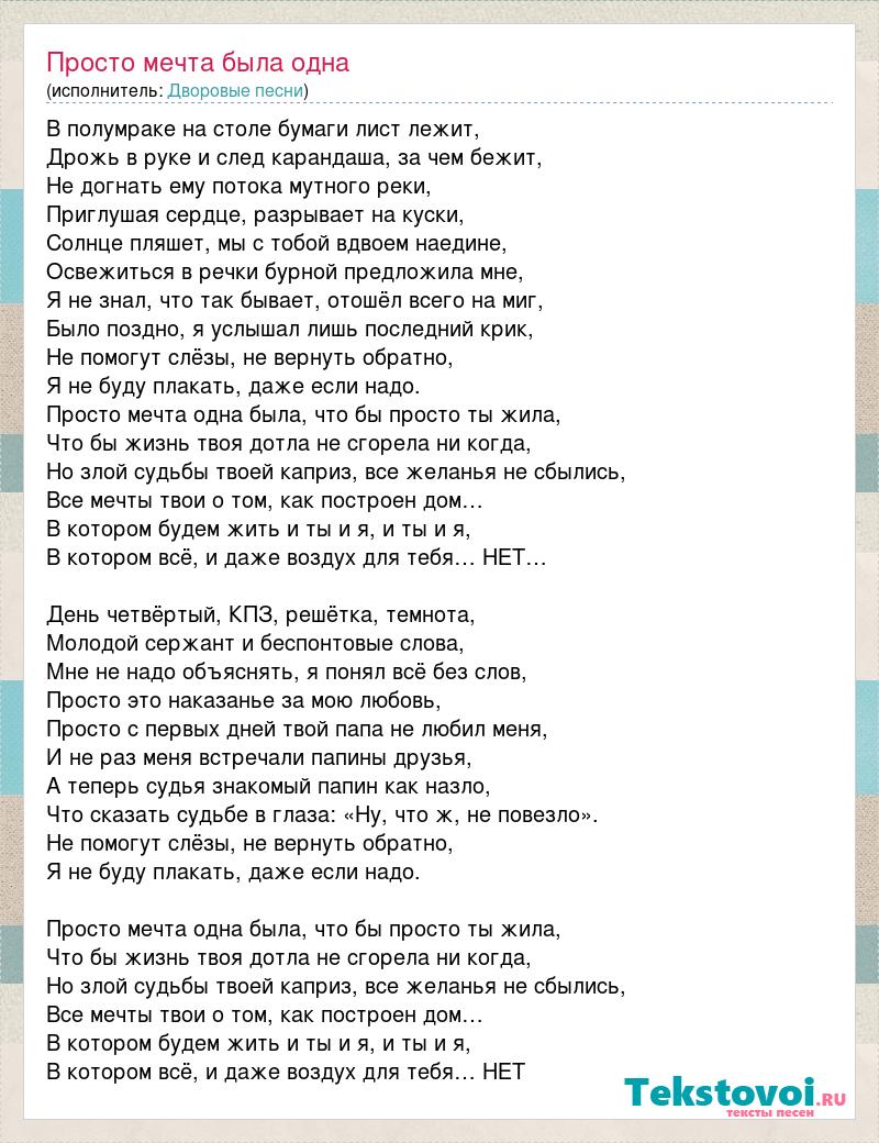 В полумраке на столе бумаги лист лежит, Дрожь в руке и след карандаша, за чем бежит, Не догнать ему потока мутного реки, Приглушая сердце, разрывает на куски, Солнце пляшет, мы с тобой вдвоем наедине, Освежиться в речки бурной предложила мне, Я не знал, что так бывает, отошёл всего на миг, Было поздно, я услышал лишь последний крик, Не помогут слёзы, не вернуть обратно, Я не буду плакать, даже если надо. Просто мечта одна была, что бы просто ты жила, Что бы жизнь твоя дотла не сгорела ни когда, Но злой судьбы твоей каприз, все желанья не сбылись, Все мечты твои о том, как построен дом… В котором будем жить и ты и я, и ты и я, В котором всё, и даже воздух для тебя… НЕТ… День четвёртый, КПЗ, решётка, темнота, Молодой сержант и беспонтовые слова, Мне не надо объяснять, я понял всё без слов, Просто это наказанье за мою любовь, Просто с первых дней твой папа не любил меня, И не раз меня встречали папины друзья, А теперь судья знакомый папин как назло, Что сказать судьбе в глаза: «Ну, что ж, не повезло». Не помогут слёзы, не вернуть обратно, Я не буду плакать, даже если надо. Просто мечта одна была, что бы просто ты жила, Что бы жизнь твоя дотла не сгорела ни когда, Но злой судьбы твоей каприз, все желанья не сбылись, Все мечты твои о том, как построен дом… В котором будем жить и ты и я, и ты и я, В котором всё, и даже воздух для тебя… НЕТ