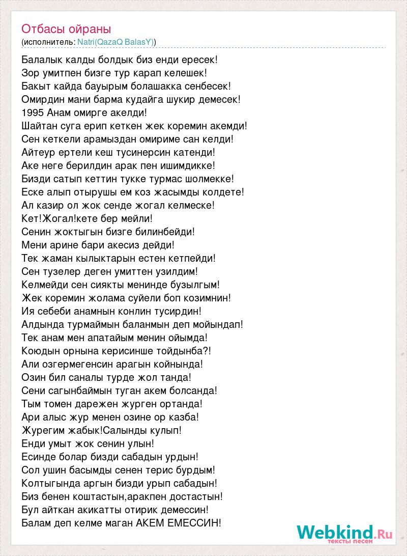 Балалык калды болдык биз енди ересек! Зор умитпен бизге тур карап келешек! Бакыт кайда бауырым болашакка сенбесек! Омирдин мани барма кудайга шукир демесек! 1995 Анам омирге акелди! Шайтан суга ерип кеткен жек коремин акемди! Сен кеткели арамыздан омириме сан келди! Айтеур ертели кеш тусинерсин катенди! Аке неге берилдин арак пен ишимдикке! Бизди сатып кеттин тукке турмас шолмекке! Еске алып отырушы ем коз жасымды колдете! Ал казир ол жок сенде жогал келмеске! Кет!Жогал!кете бер мейли! Сенин жоктыгын бизге билинбейди! Мени арине бари акесиз дейди! Тек жаман кылыктарын естен кетпейди! Сен тузелер деген умиттен узилдим! Келмейди сен сиякты менинде бузылгым! Жек коремин жолама суйели боп козимнин! Ия себеби анамнын конлин тусирдин! Алдында турмаймын баланмын деп мойындап! Тек анам мен апатайым менин ойымда! Коюдын орнына керисинше тойдынба?! Али озгермегенсин арагын койнында! Озин бил саналы турде жол танда! Сени сагынбаймын туган акем болсанда! Тым томен дарежен журген ортанда! Ари алыс жур менен озине ор казба! Журегим жабык!Салынды кулып! Енди умыт жок сенин улын! Есинде болар бизди сабадын урдын! Сол ушин басымды сенен терис бурдым! Колтыгында аргын бизди урып сабадын! Биз бенен коштастын,аракпен достастын! Бул айткан акикатты отирик демессин! Балам деп келме маган АКЕМ ЕМЕССИН!