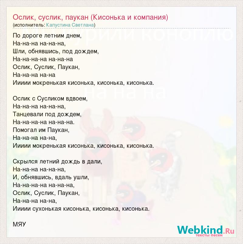 По дороге летним днем, На-на-на на-на-на, Шли, обнявшись, под дождем, На-на-на-на на-на-на Ослик, Суслик, Паукан, На-на-на на-на Иииии мокренькая кисонька, кисонька, кисонька. Ослик с Сусликом вдвоем, На-на-на на-на-на, Танцевали под дождем, На-на-на-на на-на-на. Помогал им Паукан, На-на-на на-на, Иииии мокренькая кисонька, кисонька, кисонька. Скрылся летний дождь в дали, На-на-на на-на-на, И, обнявшись, вдаль ушли, На-на-на-на на-на-на, Ослик, Суслик, Паукан, На-на-на на-на, Иииии сухонькая кисонька, кисонька, кисонька. МЯУ