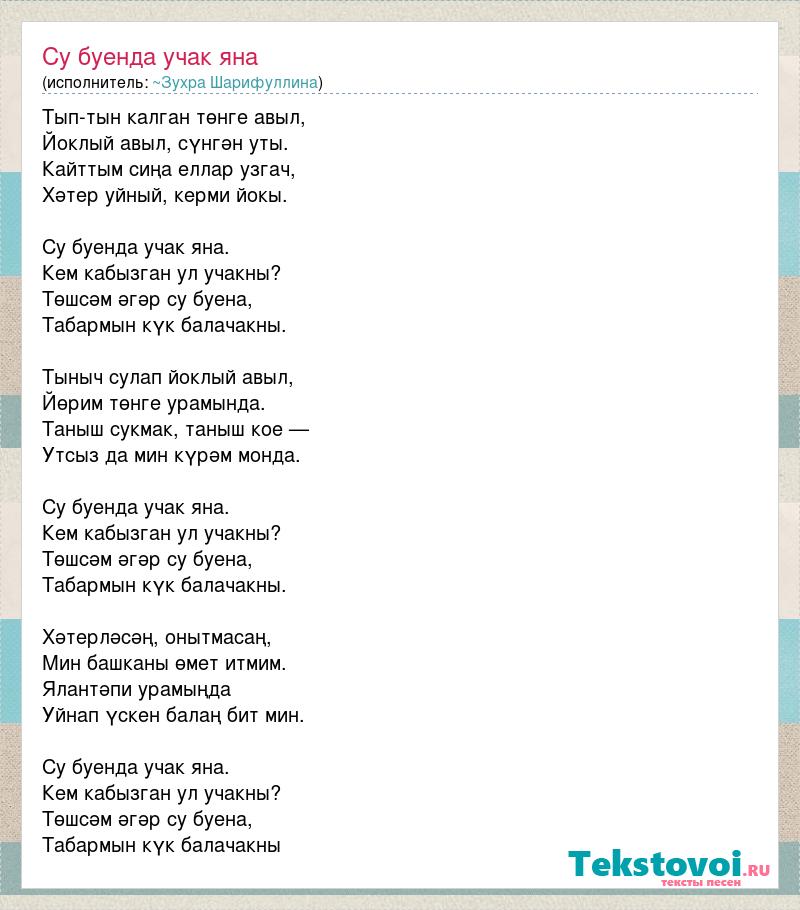 Тып-тын калган төнге авыл, Йоклый авыл, сүнгән уты. Кайттым сиңа еллар узгач, Хәтер уйный, керми йокы. Су буенда учак яна. Кем кабызган ул учакны? Төшсәм әгәр су буена, Табармын күк балачакны. Тыныч сулап йоклый авыл, Йөрим төнге урамында. Таныш сукмак, таныш кое — Утсыз да мин күрәм монда. Су буенда учак яна. Кем кабызган ул учакны? Төшсәм әгәр су буена, Табармын күк балачакны. Хәтерләсәң, онытмасаң, Мин башканы өмет итмим. Ялантәпи урамыңда Уйнап үскен балаң бит мин. Су буенда учак яна. Кем кабызган ул учакны? Төшсәм әгәр су буена, Табармын күк балачакны