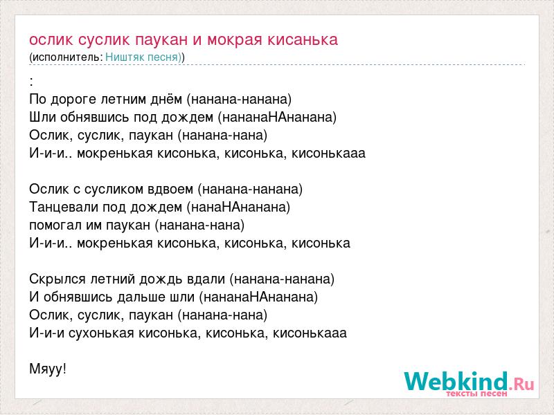 : По дороге летним днём (нанана-нанана) Шли обнявшись под дождем (нананаНАнанана) Ослик, суслик, паукан (нанана-нана) И-и-и.. мокренькая кисонька, кисонька, кисонькааа Ослик с сусликом вдвоем (нанана-нанана) Танцевали под дождем (нанаНАнанана) помогал им паукан (нанана-нана) И-и-и.. мокренькая кисонька, кисонька, кисонька Скрылся летний дождь вдали (нанана-нанана) И обнявшись дальше шли (нананаНАнанана) Ослик, суслик, паукан (нанана-нана) И-и-и сухонькая кисонька, кисонька, кисонькааа Мяуу!