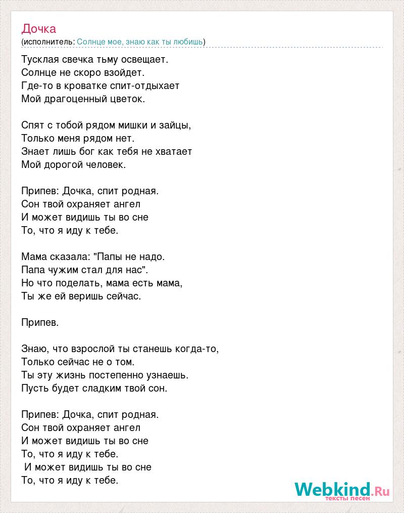 Тусклая свечка тьму освещает. Солнце не скоро взойдет. Где-то в кроватке спит-отдыхает Мой драгоценный цветок. Спят с тобой рядом мишки и зайцы, Только меня рядом нет. Знает лишь бог как тебя не хватает Мой дорогой человек. Припев: Дочка, спит родная. Сон твой охраняет ангел И может видишь ты во сне То, что я иду к тебе. Мама сказала: "Папы не надо. Папа чужим стал для нас". Но что поделать, мама есть мама, Ты же ей веришь сейчас. Припев. Знаю, что взрослой ты станешь когда-то, Только сейчас не о том. Ты эту жизнь постепенно узнаешь. Пусть будет сладким твой сон. Припев: Дочка, спит родная. Сон твой охраняет ангел И может видишь ты во сне То, что я иду к тебе. И может видишь ты во сне То, что я иду к тебе.
