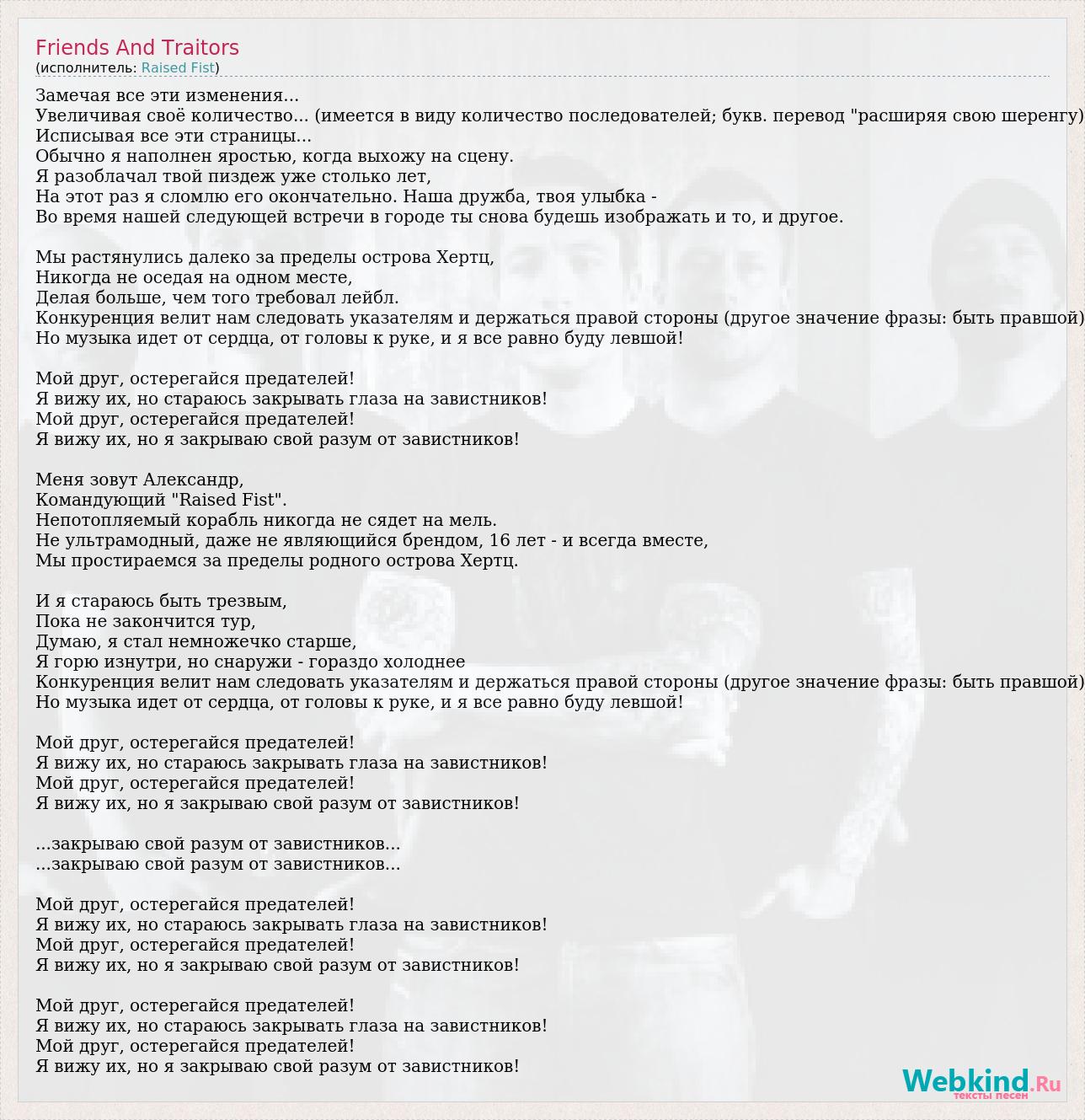 Замечая все эти изменения... Увеличивая своё количество... (имеется в виду количество последователей; букв. перевод "расширяя свою шеренгу) Исписывая все эти страницы... Обычно я наполнен яростью, когда выхожу на сцену. Я разоблачал твой пиздеж уже столько лет, На этот раз я сломлю его окончательно. Наша дружба, твоя улыбка - Во время нашей следующей встречи в городе ты снова будешь изображать и то, и другое. Мы растянулись далеко за пределы острова Хертц, Никогда не оседая на одном месте, Делая больше, чем того требовал лейбл. Конкуренция велит нам следовать указателям и держаться правой стороны (другое значение фразы: быть правшой) Но музыка идет от сердца, от головы к руке, и я все равно буду левшой! Мой друг, остерегайся предателей! Я вижу их, но стараюсь закрывать глаза на завистников! Мой друг, остерегайся предателей! Я вижу их, но я закрываю свой разум от завистников! Меня зовут Александр, Командующий "Raised Fist". Непотопляемый корабль никогда не сядет на мель. Не ультрамодный, даже не являющийся брендом, 16 лет - и всегда вместе, Мы простираемся за пределы родного острова Хертц. И я стараюсь быть трезвым, Пока не закончится тур, Думаю, я стал немножечко старше, Я горю изнутри, но снаружи - гораздо холоднее Конкуренция велит нам следовать указателям и держаться правой стороны (другое значение фразы: быть правшой) Но музыка идет от сердца, от головы к руке, и я все равно буду левшой! Мой друг, остерегайся предателей! Я вижу их, но стараюсь закрывать глаза на завистников! Мой друг, остерегайся предателей! Я вижу их, но я закрываю свой разум от завистников! ...закрываю свой разум от завистников... ...закрываю свой разум от завистников... Мой друг, остерегайся предателей! Я вижу их, но стараюсь закрывать глаза на завистников! Мой друг, остерегайся предателей! Я вижу их, но я закрываю свой разум от завистников! Мой друг, остерегайся предателей! Я вижу их, но стараюсь закрывать глаза на завистников! Мой друг, остерегайся предателей! Я вижу их, но я закрываю свой разум от завистников!
