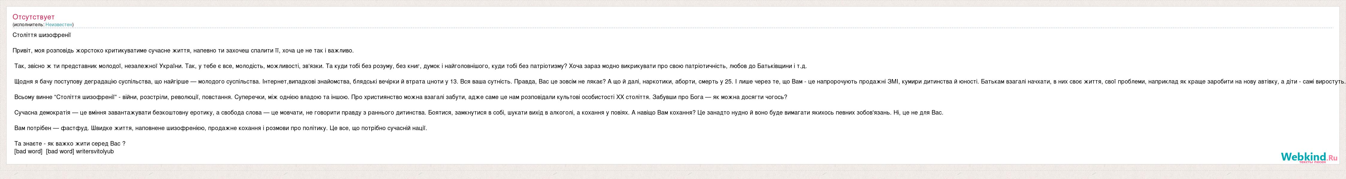 Століття шизофренії Привіт, моя розповідь жорстоко критикуватиме сучасне життя, напевно ти захочеш спалити її, хоча це не так і важливо. Так, звісно ж ти представник молодої, незалежної України. Так, у тебе є все, молодість, можливості, зв‘язки. Та куди тобі без розуму, без книг, думок і найголовнішого, куди тобі без патріотизму? Хоча зараз модно викрикувати про свою патріотичність, любов до Батьківщини і т.д. Щодня я бачу поступову деградацію суспільства, що найгірше — молодого суспільства. Інтернет,випадкові знайомства, блядські вечірки й втрата цноти у 13. Вся ваша сутність. Правда, Вас це зовсім не лякає? А що й далі, наркотики, аборти, смерть у 25. І лише через те, що Вам - це напророчують продажні ЗМІ, кумири дитинства й юності. Батькам взагалі начхати, в них своє життя, свої проблеми, наприклад як краще заробити на нову автівку, а діти - самі виростуть. Всьому винне “Століття шизофренії” - війни, розстріли, революції, повстання. Суперечки, між однією владою та іншою. Про християнство можна взагалі забути, адже саме це нам розповідали культові особистості XX століття. Забувши про Бога — як можна досягти чогось? Сучасна демократія — це вміння завантажувати безкоштовну еротику, а свобода слова — це мовчати, не говорити правду з раннього дитинства. Боятися, замкнутися в собі, шукати вихід в алкоголі, а кохання у повіях. А навіщо Вам кохання? Це занадто нудно й воно буде вимагати якихось певних зобов'язань. Ні, це не для Вас. Вам потрібен — фастфуд. Швидке життя, наповнене шизофренією, продажне кохання і розмови про політику. Це все, що потрібно сучасній нації. Та знаєте - як важко жити серед Вас ? [bad word] [bad word] writersvitolyub