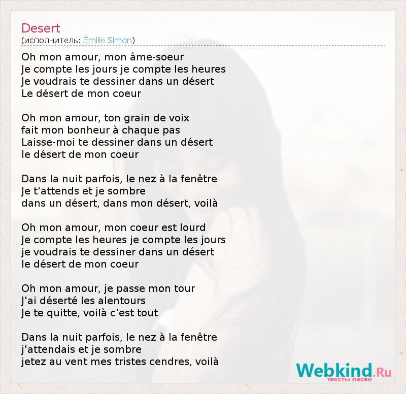 О, любовь моя, душевная сестра, Я считаю дни, считаю часы. Я хотела бы нарисовать тебя в пустыне, В пустыне моего сердца. О, любовь моя, крупица твоего голоса Привносит счастье с каждым моим шагом. Позволь мне нарисовать тебя в пустыне, В пустыне моего сердца. Иногда в ночи, уткнувшись носом в окно, Я жду тебя и гибну В пустыне, в своей пустыне, вот так. О, любовь моя, сердце мое тяжело. Я считаю дни, считаю часы. Я хотела бы нарисовать тебя в пустыне, В пустыне моего сердца. О, любовь моя, я пропускаю свою очередь. Я покинула окрестности, Я покидаю тебя, вот и все... Иногда в ночи, уткнувшись носом в окно, Я жду тебя и гибну В пустыне, в своей пустыне, вот так.