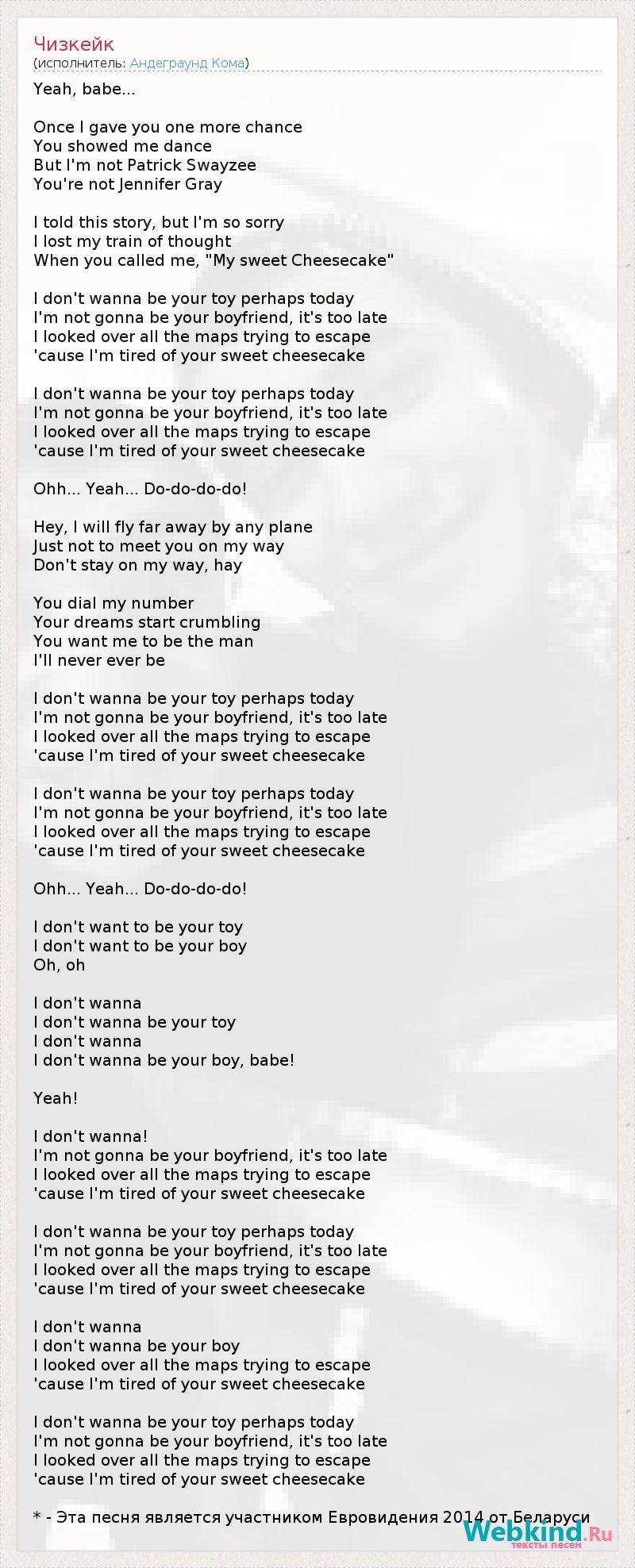 Yeah, babe... Once I gave you one more chance You showed me dance But I'm not Patrick Swayzee You're not Jennifer Gray I told this story, but I'm so sorry I lost my train of thought When you called me, "My sweet Cheesecake" I don't wanna be your toy perhaps today I'm not gonna be your boyfriend, it's too late I looked over all the maps trying to escape 'cause I'm tired of your sweet cheesecake I don't wanna be your toy perhaps today I'm not gonna be your boyfriend, it's too late I looked over all the maps trying to escape 'cause I'm tired of your sweet cheesecake Ohh... Yeah... Do-do-do-do! Hey, I will fly far away by any plane Just not to meet you оn my way Don't stay on my way, hay You dial my number Your dreams start crumbling You want me to be the man I'll never ever be I don't wanna be your toy perhaps today I'm not gonna be your boyfriend, it's too late I looked over all the maps trying to escape 'cause I'm tired of your sweet cheesecake I don't wanna be your toy perhaps today I'm not gonna be your boyfriend, it's too late I looked over all the maps trying to escape 'cause I'm tired of your sweet cheesecake Ohh... Yeah... Do-do-do-do! I don't want to be your toy I don't want to be your boy Oh, oh I don't wanna I don't wanna be your toy I don't wanna I don't wanna be your boy, babe! Yeah! I don't wanna! I'm not gonna be your boyfriend, it's too late I looked over all the maps trying to escape 'cause I'm tired of your sweet cheesecake I don't wanna be your toy perhaps today I'm not gonna be your boyfriend, it's too late I looked over all the maps trying to escape 'cause I'm tired of your sweet cheesecake I don't wanna I don't wanna be your boy I looked over all the maps trying to escape 'cause I'm tired of your sweet cheesecake I don't wanna be your toy perhaps today I'm not gonna be your boyfriend, it's too late I looked over all the maps trying to escape 'cause I'm tired of your sweet cheesecake * - Эта песня является участником Евровидения 2014 от Беларуси