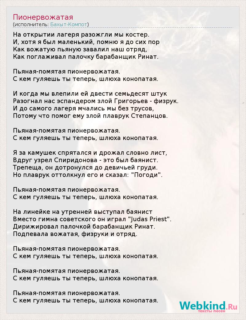 На открытии лагеря разожгли мы костер. И, хотя я был маленький, помню я до сих пор Как вожатую пьяную завалил наш отряд, Как поглаживал палочку барабанщик Ринат. Пьяная-помятая пионервожатая. С кем гуляешь ты теперь, шлюха конопатая. И когда мы влепили ей двести семьдесят штук Разогнал нас эспандером злой Григорьев - физрук. И до самого лагеря мчались мы без трусов, Потому что помог ему злой плаврук Степанцов. Пьяная-помятая пионервожатая. С кем гуляешь ты теперь, шлюха конопатая. Я за камушек спрятался и дрожал словно лист, Вдруг узрел Спиридонова - это был баянист. Трепеща, он дотронулся до девичьей груди. Но плаврук оттолкнул его и сказал: "Погоди". Пьяная-помятая пионервожатая. С кем гуляешь ты теперь, шлюха конопатая. На линейке на утренней выступал баянист Вместо гимна советского он играл "Judas Priest". Дирижировал палочкой барабанщик Ринат. Подпевала вожатая, физруки и отряд. Пьяная-помятая пионервожатая. С кем гуляешь ты теперь, шлюха конопатая. Пьяная-помятая пионервожатая. С кем гуляешь ты теперь, шлюха конопатая. Пьяная-помятая пионервожатая. С кем гуляешь ты теперь, шлюха конопатая.
