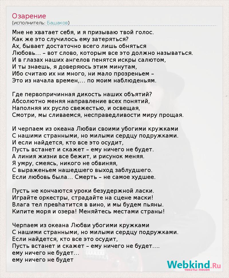 Мне не хватает себя, и я призываю твой голос. Как же это случилось ему затеряться? Ах, бывает достаточно всего лишь обняться Любовь… – вот слово, которым все это должно называться. И в глазах наших ангелов пенятся искры салютом, И ты знаешь, я доверяюсь этим минутам, Ибо считаю их ни много, ни мало прозреньем – Это из начала времен,… по моим наблюденьям. Где первопричинная дикость наших объятий? Абсолютно меняя направление всех понятий, Наполняя их русло свежестью, и освещая, Смотри, мы сливаемся, несправедливости миру прощая. И черпаем из океана Любви своими убогими кружками С нашими странными, но милыми сердцу подружками. И если найдется, кто все это осудит, Пусть встанет и скажет – ему ничего не будет. А линия жизни все бежит, и рисунок меняя. Я умру, смеясь, никого не обвиняя, С выраженьем нашедшего выход заблудшего. Если любовь была… Смерть – не самое худшее. Пусть не кончаются уроки безудержной ласки. Играйте оркестры, страдайте на сцене маски! Влага тел превhатится в вино, и мы будем пьяны. Кипите моря и озера! Меняйтесь местами страны! Черпаем из океана Любви убогими кружками С нашими странными, но милыми сердцу подружками. Если найдется, кто все это осудит, Пусть встанет и скажет – ему ничего не будет…. ему ничего не будет… ему ничего не будет