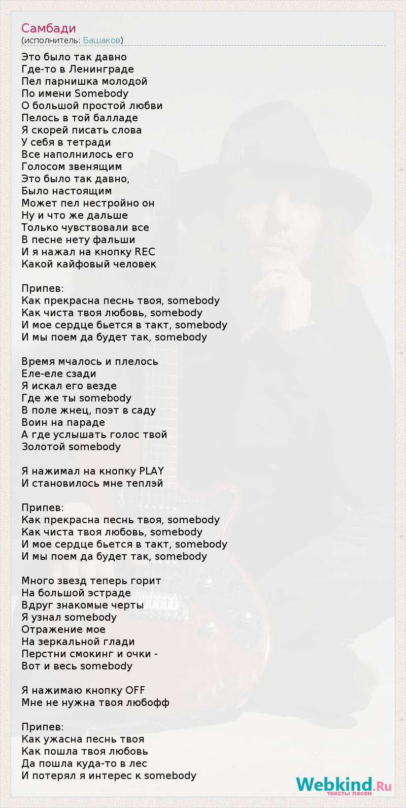 Это было так давно Где-то в Ленинграде Пел парнишка молодой По имени Somebody О большой простой любви Пелось в той балладе Я скорей писать слова У себя в тетради Все наполнилось его Голосом звенящим Это было так давно, Было настоящим Может пел нестройно он Hу и что же дальше Только чувствовали все В песне нету фальши И я нажал на кнопку REC Какой кайфовый человек Припев: Как прекрасна песнь твоя, somebody Как чиста твоя любовь, somebody И мое сердце бьется в такт, somebody И мы поем да будет так, somebody Время мчалось и плелось Еле-еле сзади Я искал его везде Где же ты somebody В поле жнец, поэт в саду Воин на параде А где услышать голос твой Золотой somebody Я нажимал на кнопку PLAY И становилось мне теплэй Припев: Как прекрасна песнь твоя, somebody Как чиста твоя любовь, somebody И мое сердце бьется в такт, somebody И мы поем да будет так, somebody Много звезд теперь горит Hа большой эстраде Вдруг знакомые черты Я узнал somebody Отражение мое Hа зеркальной глади Перстни смокинг и очки - Вот и весь somebody Я нажимаю кнопку OFF Мне не нужна твоя любофф Припев: Как ужасна песнь твоя Как пошла твоя любовь Да пошла куда-то в лес И потерял я интерес к somebody