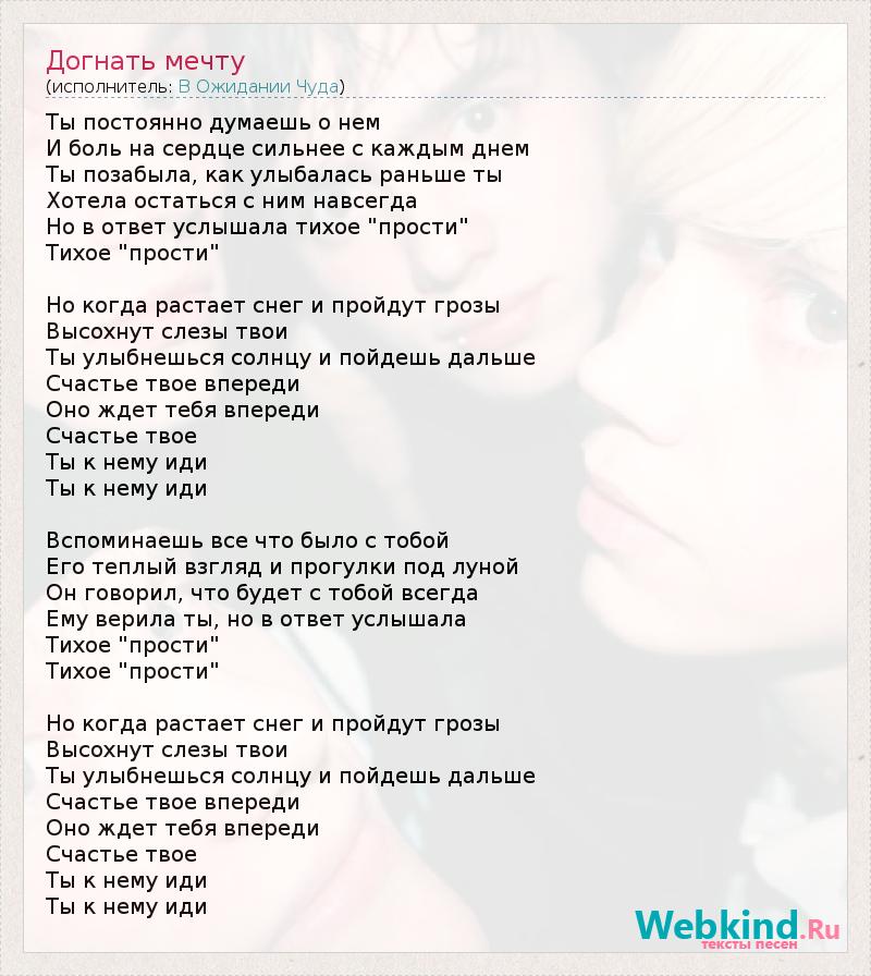 Ты постоянно думаешь о нем И боль на сердце сильнее с каждым днем Ты позабыла, как улыбалась раньше ты Хотела остаться с ним навсегда Но в ответ услышала тихое "прости" Тихое "прости" Но когда растает снег и пройдут грозы Высохнут слезы твои Ты улыбнешься солнцу и пойдешь дальше Счастье твое впереди Оно ждет тебя впереди Счастье твое Ты к нему иди Ты к нему иди Вспоминаешь все что было с тобой Его теплый взгляд и прогулки под луной Он говорил, что будет с тобой всегда Ему верила ты, но в ответ услышала Тихое "прости" Тихое "прости" Но когда растает снег и пройдут грозы Высохнут слезы твои Ты улыбнешься солнцу и пойдешь дальше Счастье твое впереди Оно ждет тебя впереди Счастье твое Ты к нему иди Ты к нему иди
