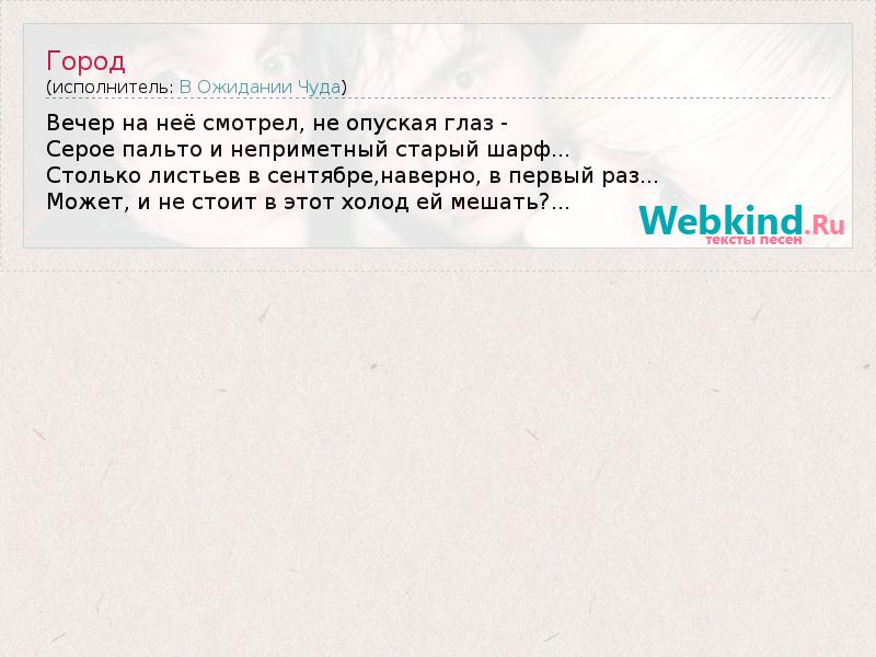 Вечер на неё смотрел, не опуская глаз - Серое пальто и неприметный старый шарф... Столько листьев в сентябре,наверно, в первый раз... Может, и не стоит в этот холод ей мешать?...