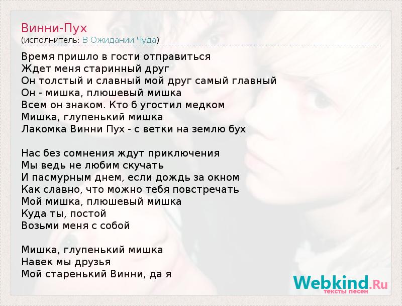 Время пришло в гости отправиться Ждет меня старинный друг Он толстый и славный мой друг самый главный Он - мишка, плюшевый мишка Всем он знаком. Кто б угостил медком Мишка, глупенький мишка Лакомка Винни Пух - с ветки на землю бух Нас без сомнения ждут приключения Мы ведь не любим скучать И пасмурным днем, если дождь за окном Как славно, что можно тебя повстречать Мой мишка, плюшевый мишка Куда ты, постой Возьми меня с собой Мишка, глупенький мишка Навек мы друзья Мой старенький Винни, да я